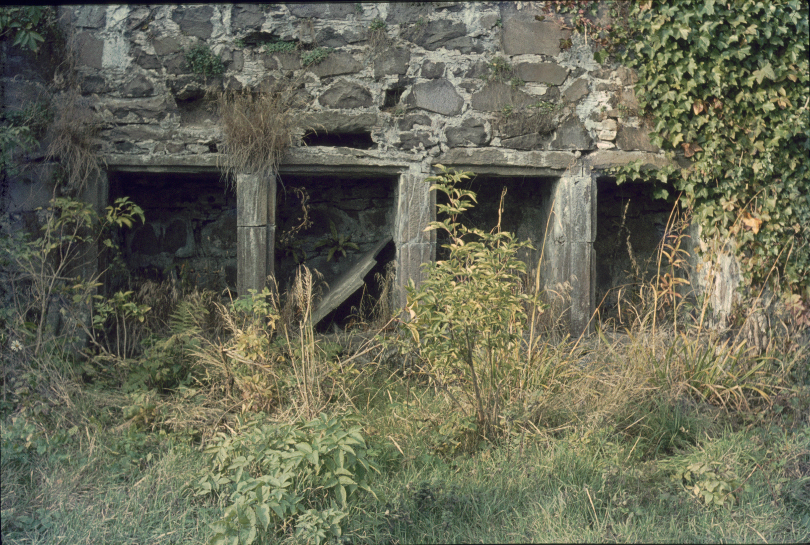 3 or 4 boles, on outside of garden wall; rebated edges (for boards?); in one there is stone slab with hole - may have been used to close up bee bole; 2005: all except one are behind piles of tiles; wall completely overgrown with ivy