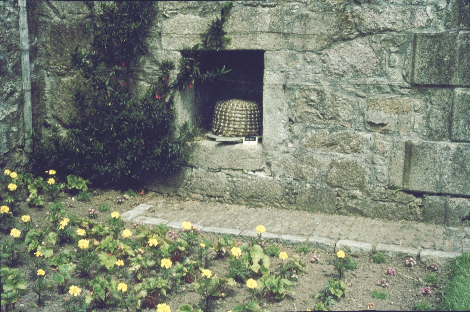 NT for Scotland; bee boles are in lower garden: 2 below the steps, one in small building wall, 2 in garden wall, one in another nearby wall; in 1967, one contained a skep, now a shaped stone skep base (see photo)