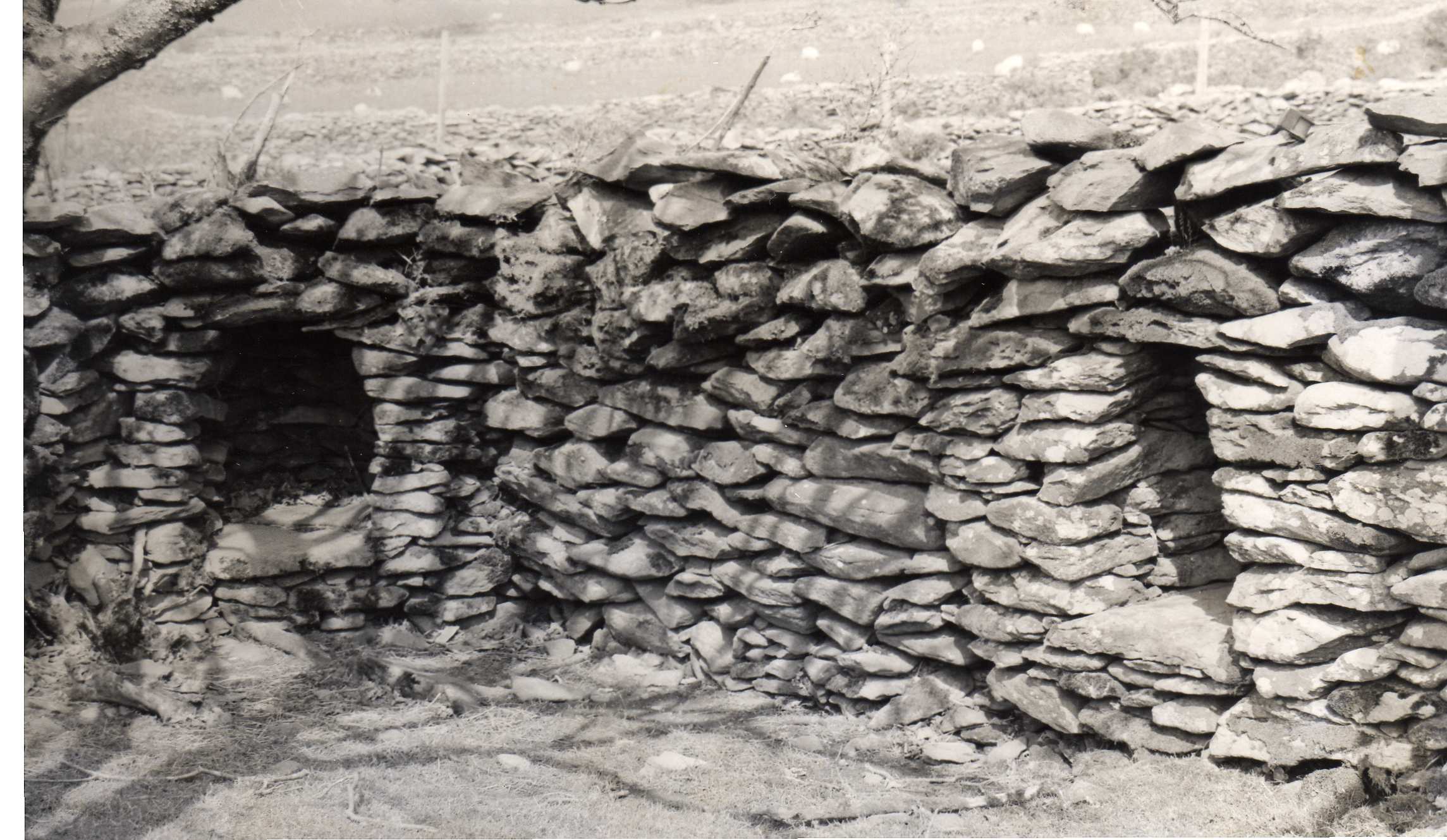 shape: arch with curved sides, flat top; bases of large slabs; one facing S is in angle between 2 drystone walls