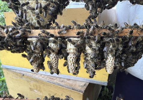 Images from Dr Roessink showing queen cells used for the project and the colonies of Nuc hives recieving a designated amount of worker bees.