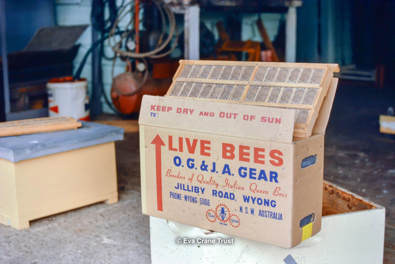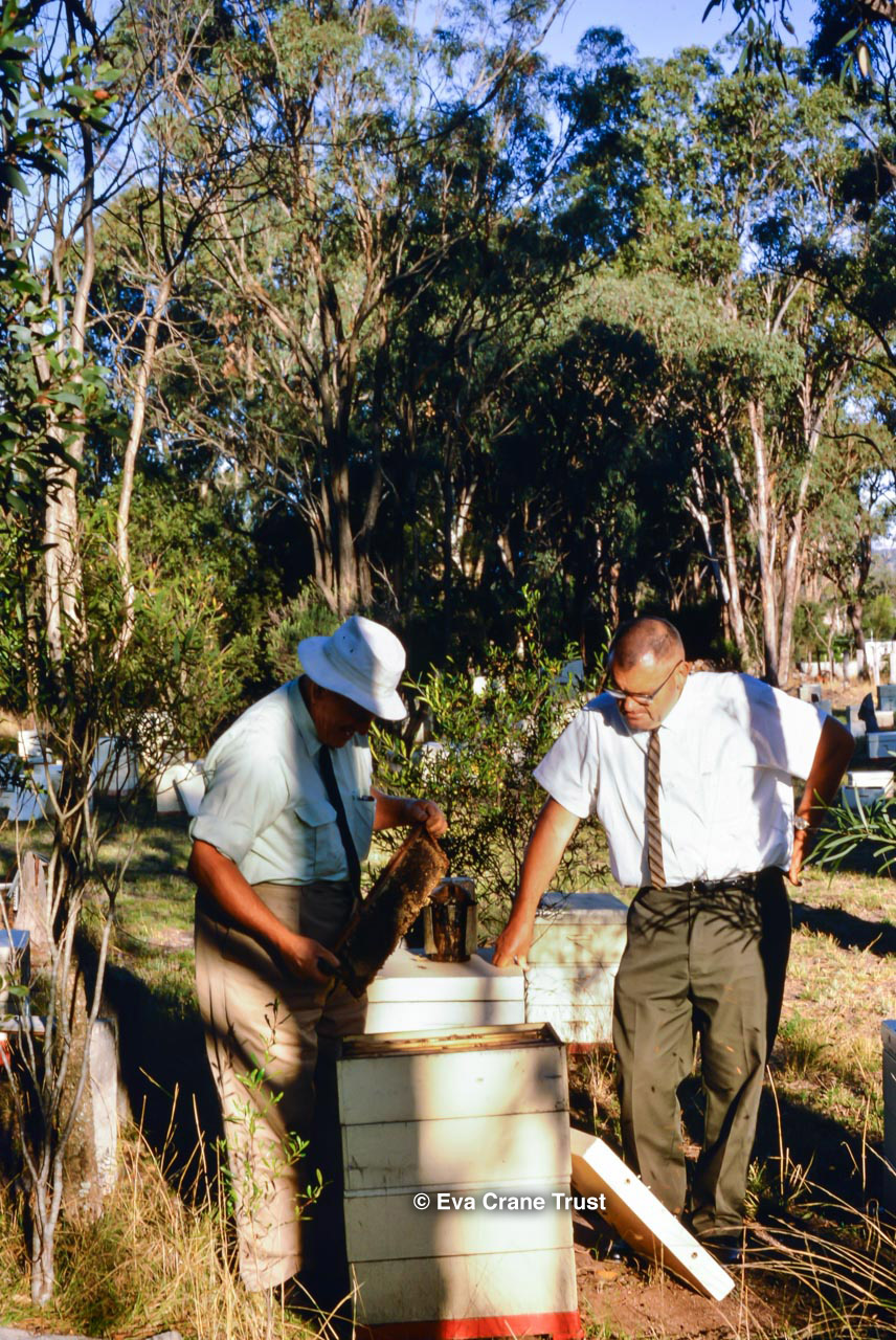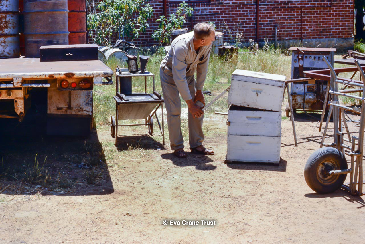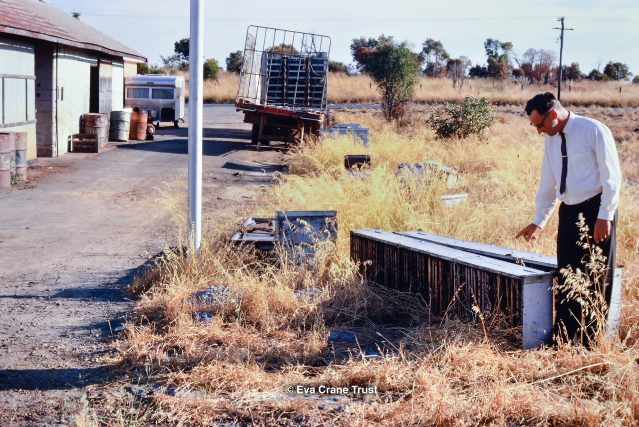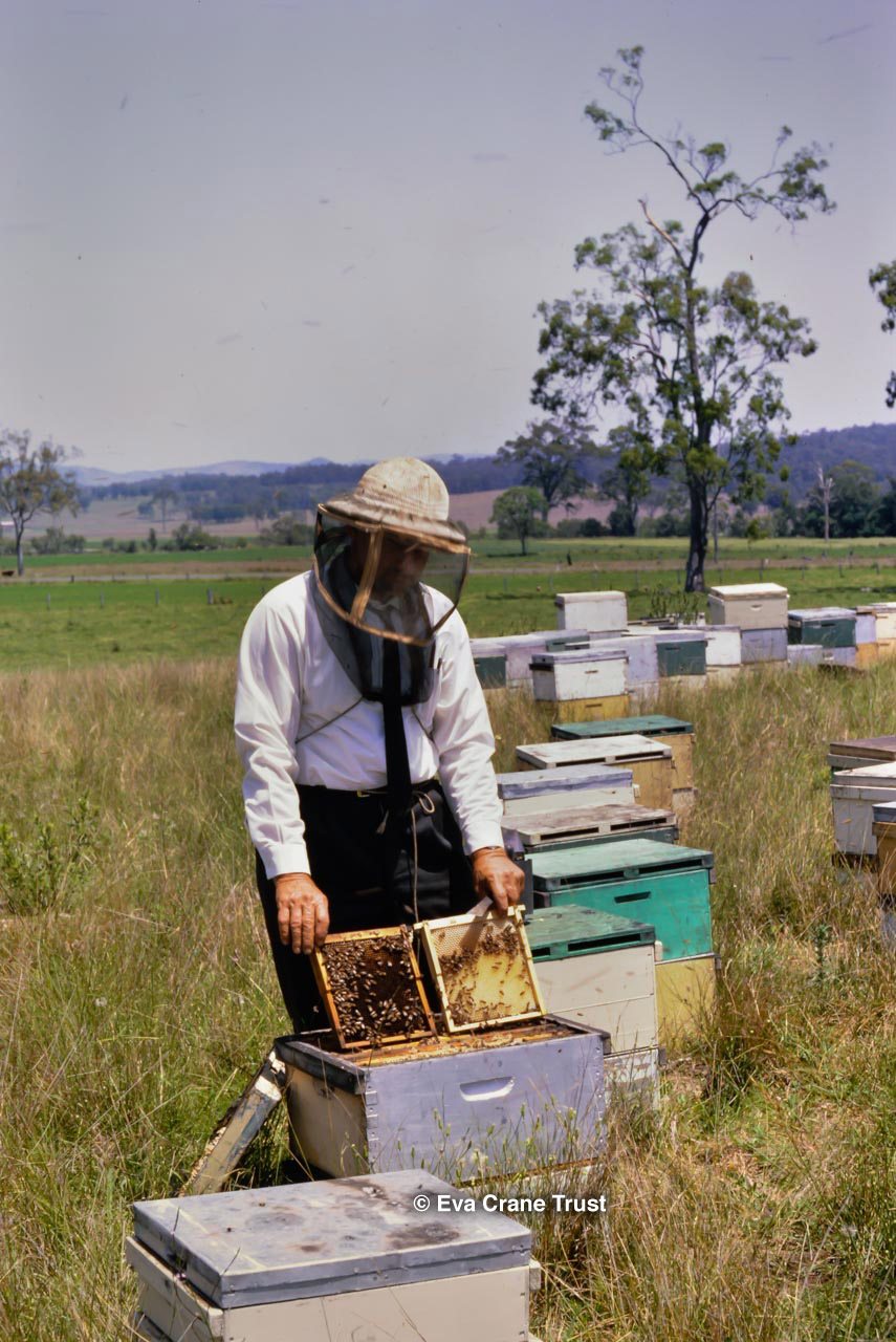 AUSTRALIA, Queensland , 1967, Norman Rice showing hive with half-frames. Irrigated alfalfa.