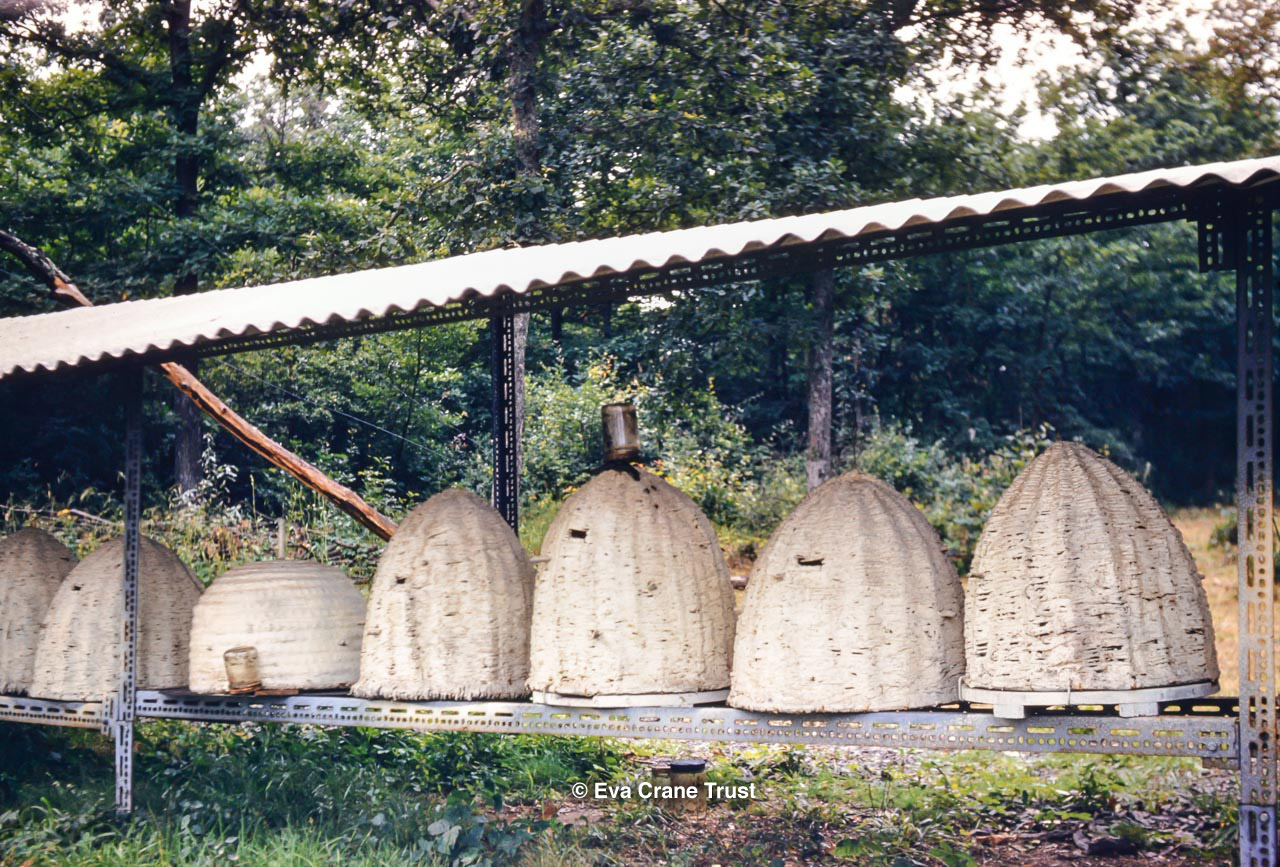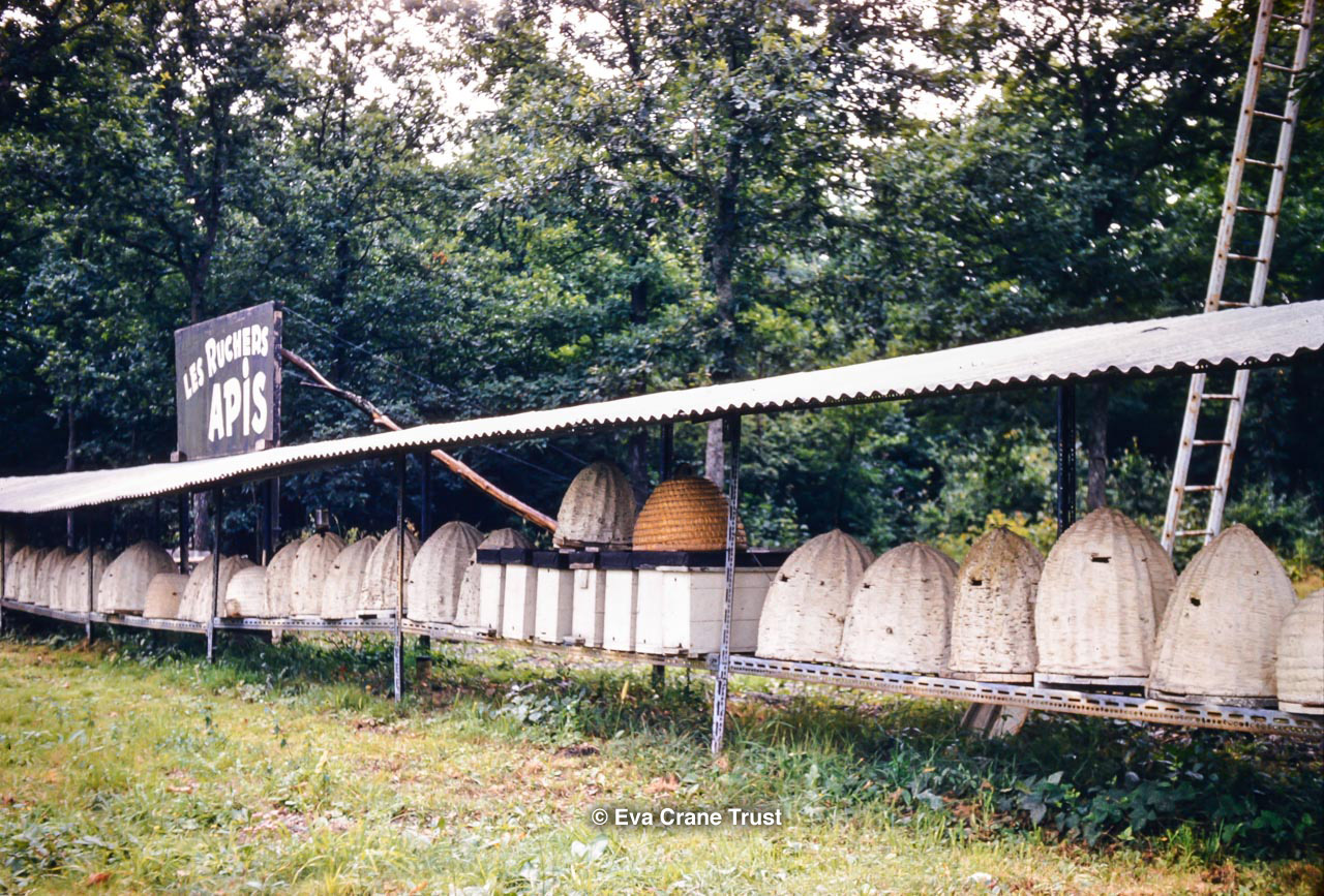 BELGIUM, 1960, Apiary of wicker hives at Esso station at Marche.