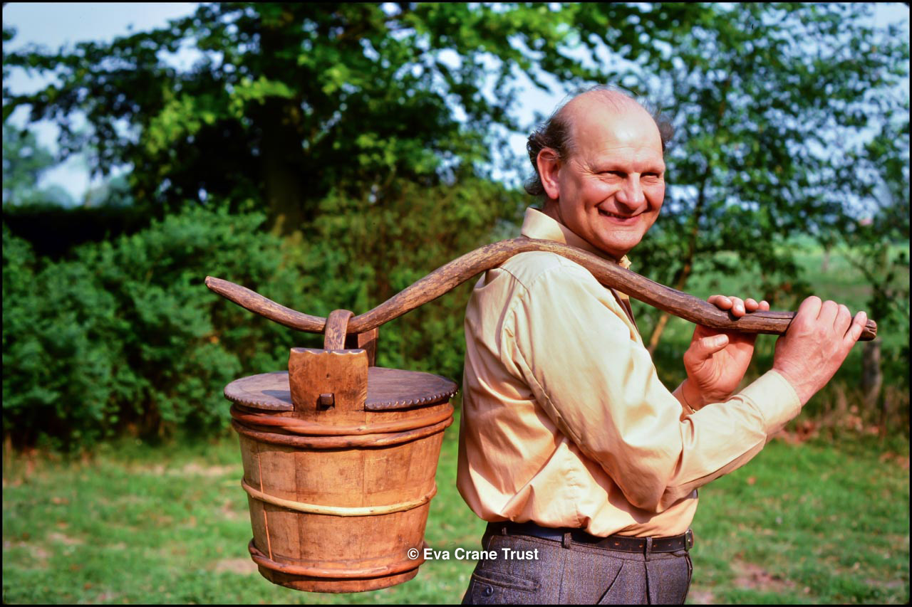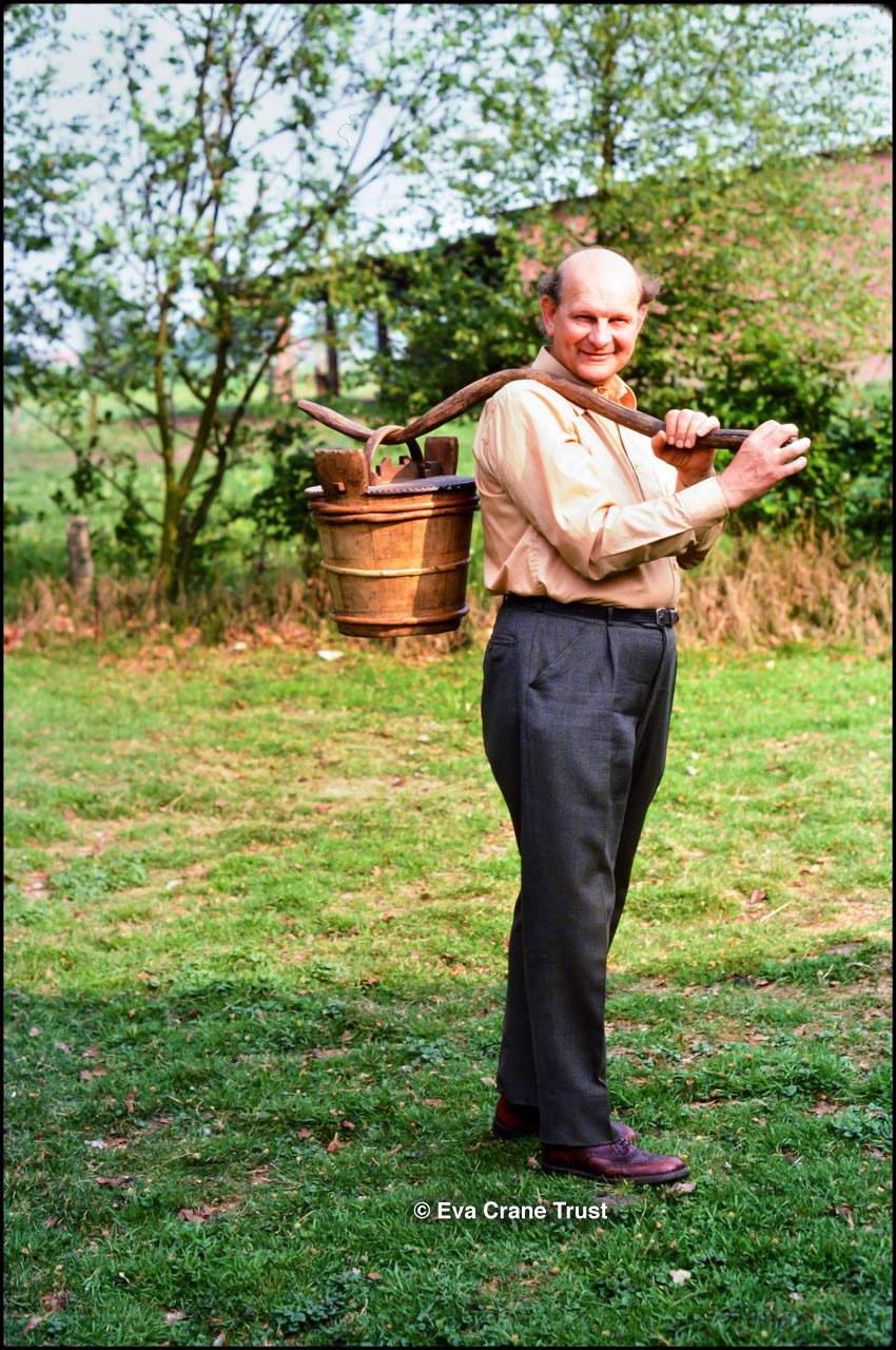 BELGIUM, Belgium Beekeeping Museums (2) Kalmthout, Mr Schoof carrying ?swarm container.