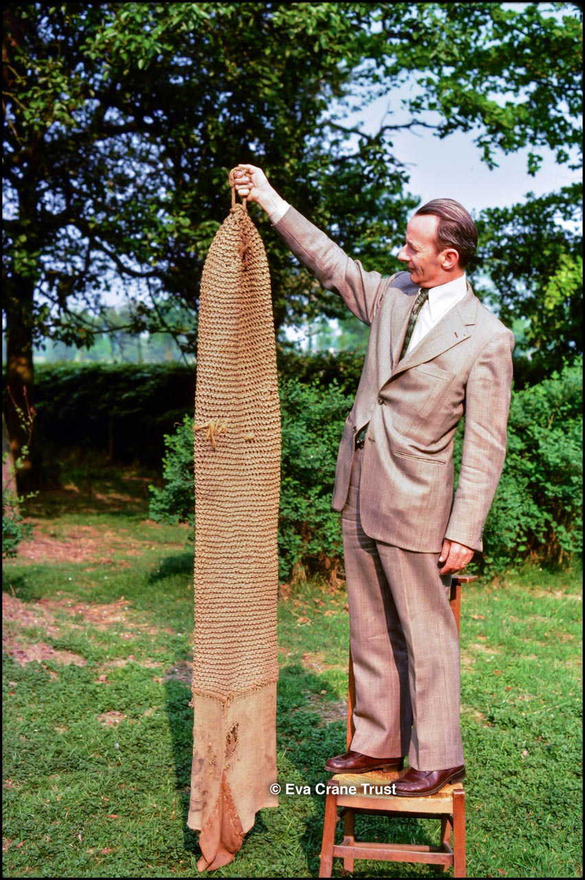 BELGIUM,1976, Belgium Beekeeping Museums (2) Kalmthout, Dr Van Laere holding up a ?swarm catcher.