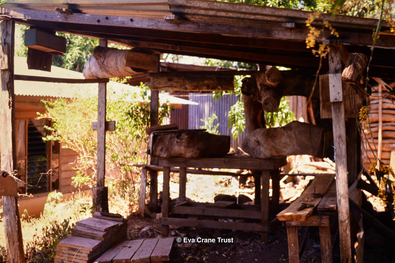 Costa Rica 1991, Nicoya peninsula, Don Pedro's house (and horse) at Santa Barbara with hives of Melipona beecheii.