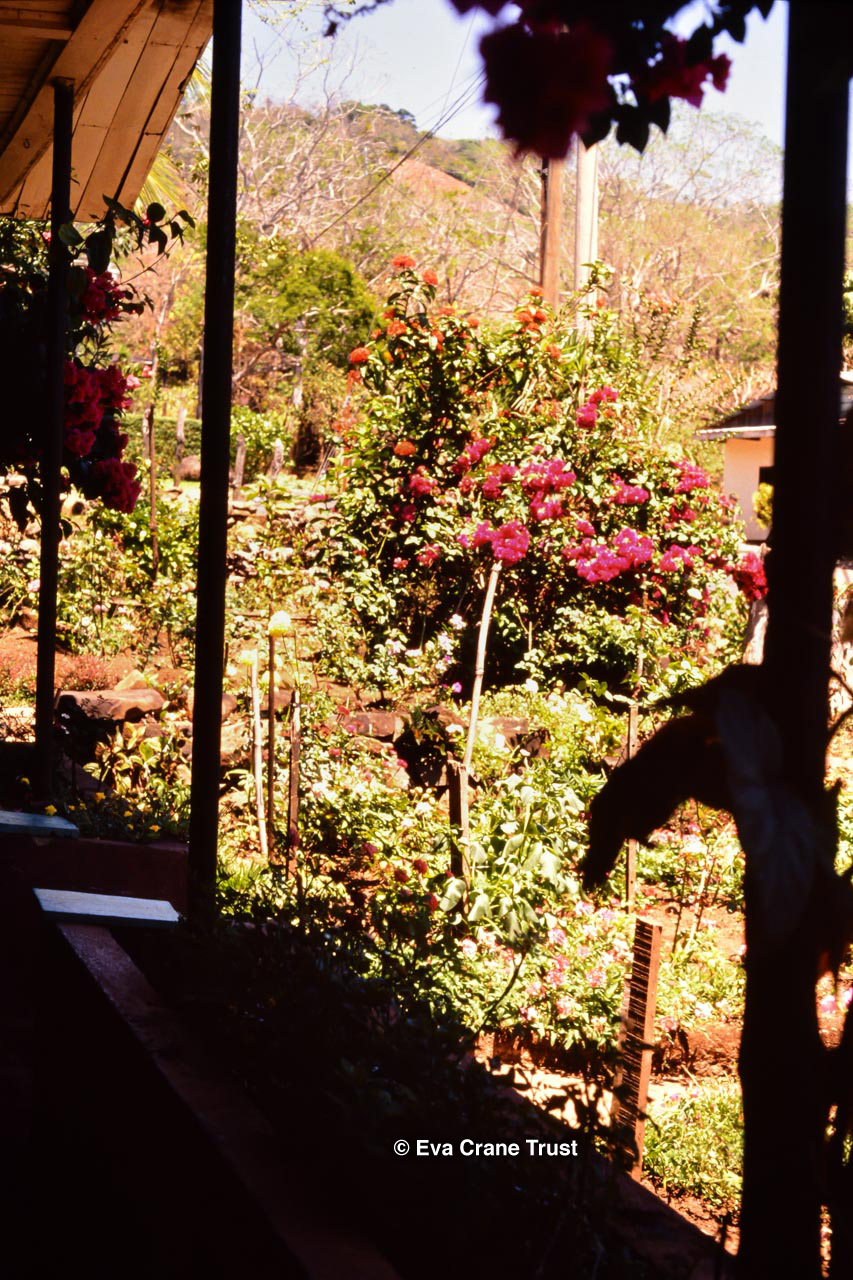 Costa Rica 1991, Hives of stingless bees north of Heredia, View of garden.