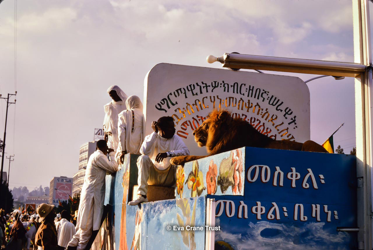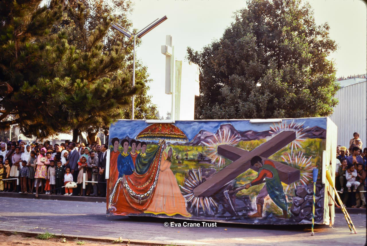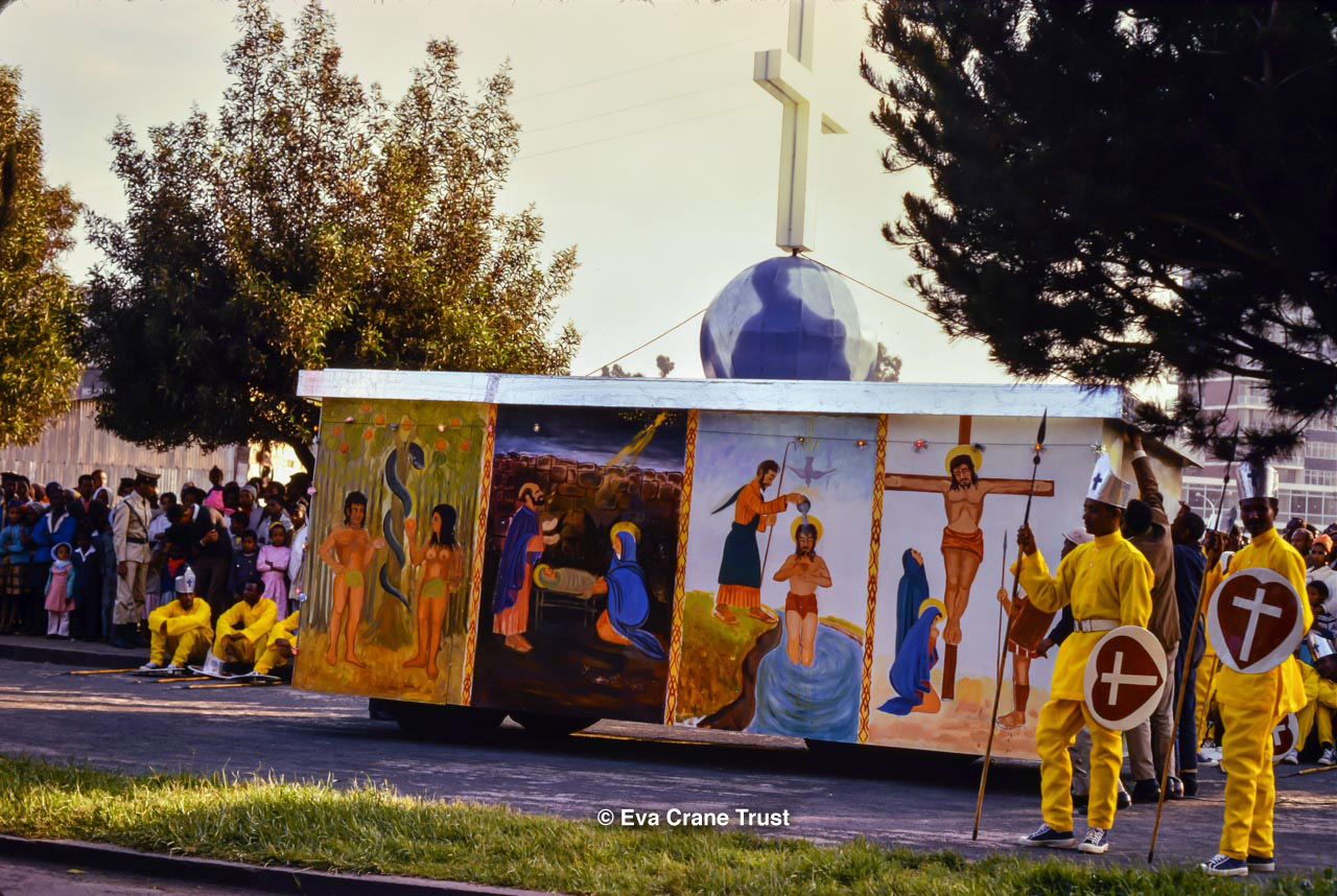 ETHIOPIA, Sept / Oct 1973, Maskal Festival, Church float (Adam & Eve Christ's birth baptism of John crucifixion).