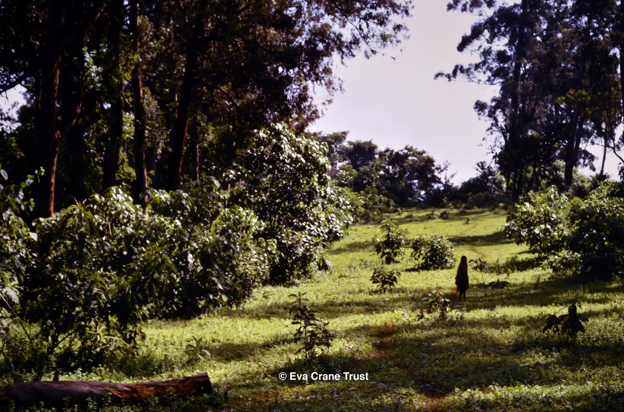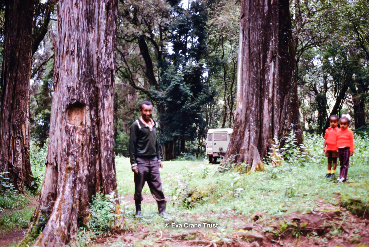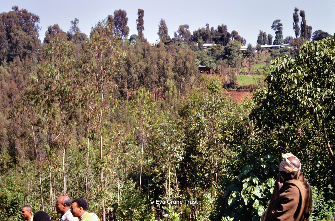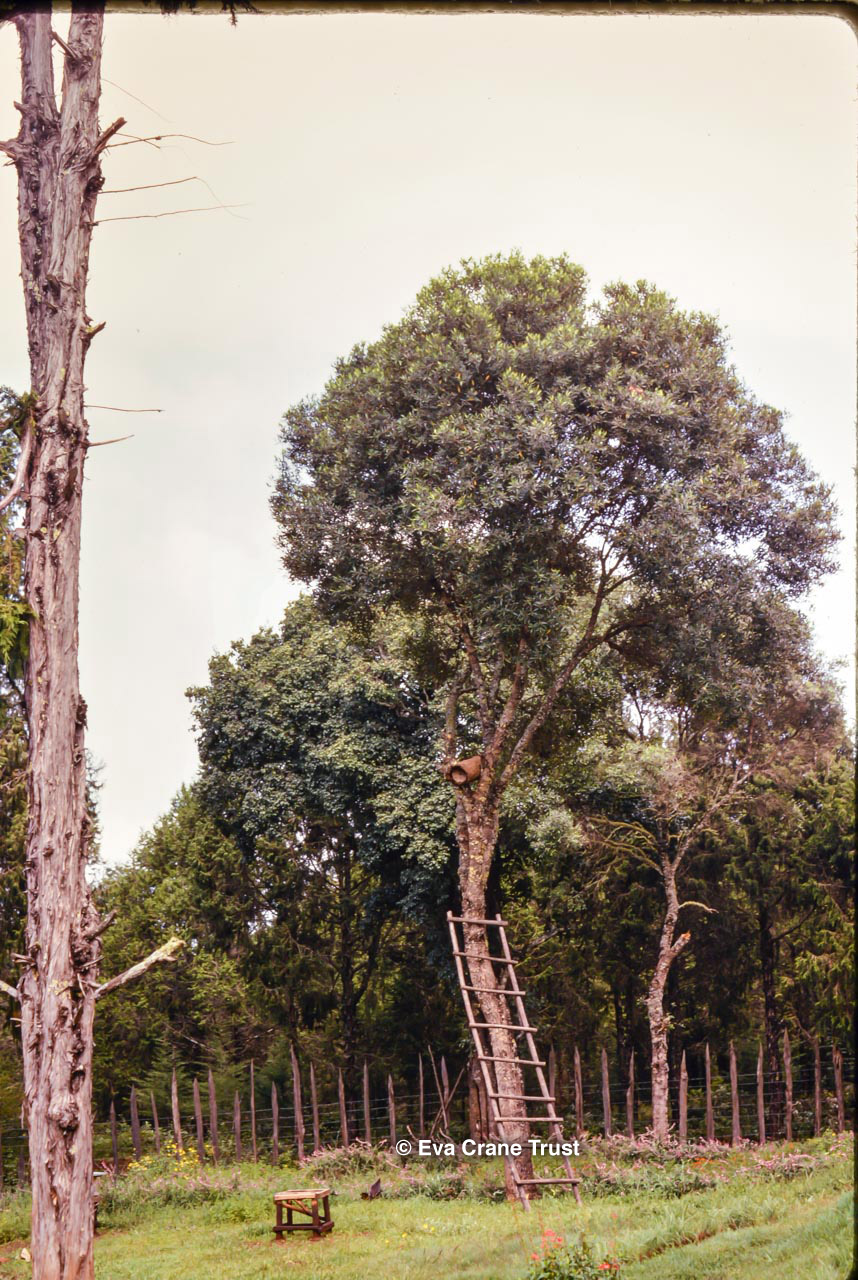 ETHIOPIA, Sept / Oct 1973, Holetta Beekeeping Station, Outstation at Managsha Suba. Ladder in position against tree to reach hive or wild colony.