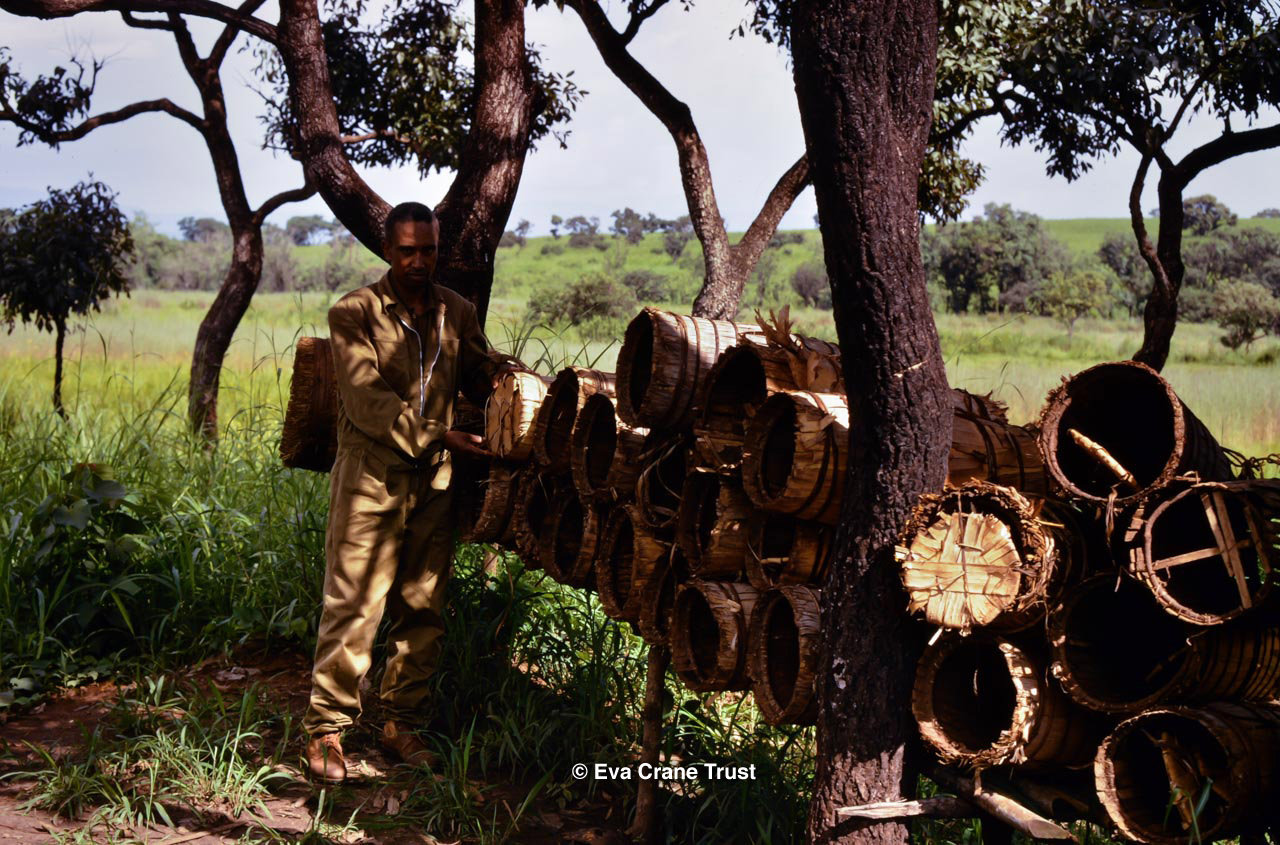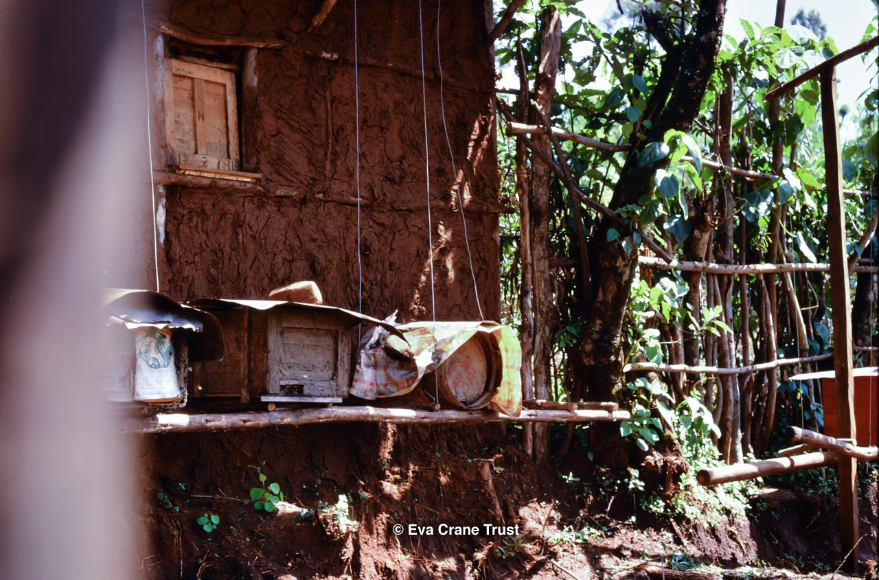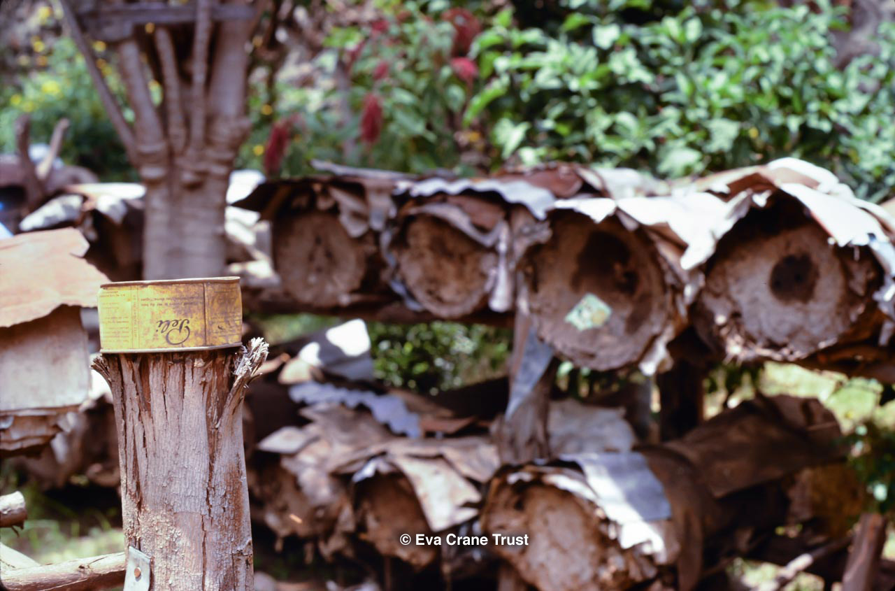 ETHIOPIA, Sept / Oct 1973, Rift Valley (Maskal holiday), Debre Zeyet. Peasant apiary with Apis mellifera adansonii.