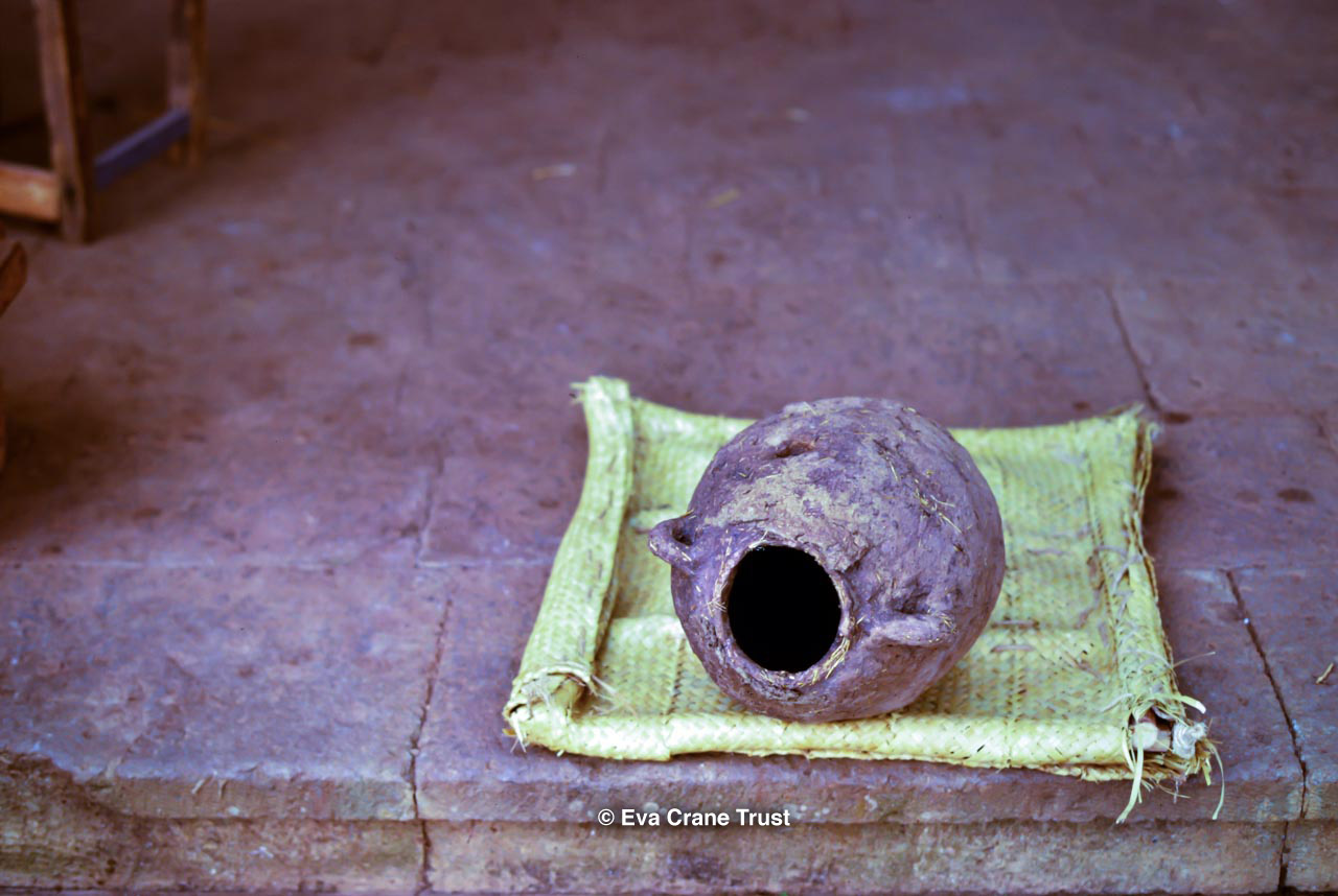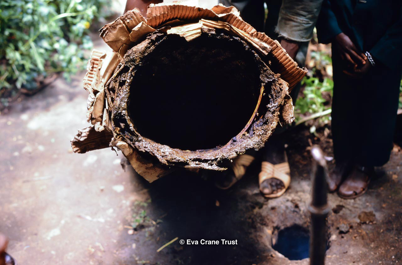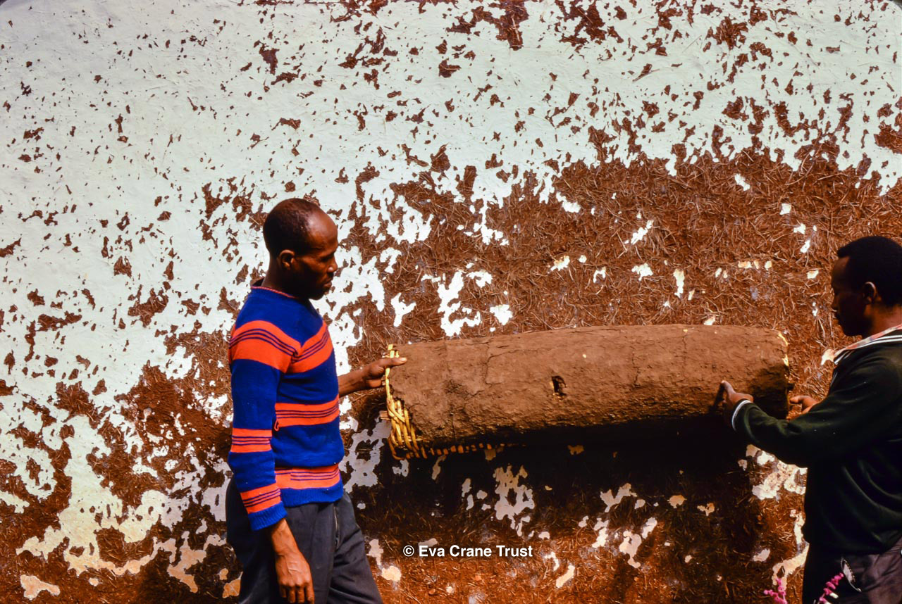 ETHIOPIA, Sept / Oct 1973, Holetta Beekeeping Station, Mud (Simien-type) hive with bag for honey(?) - on hive lid.