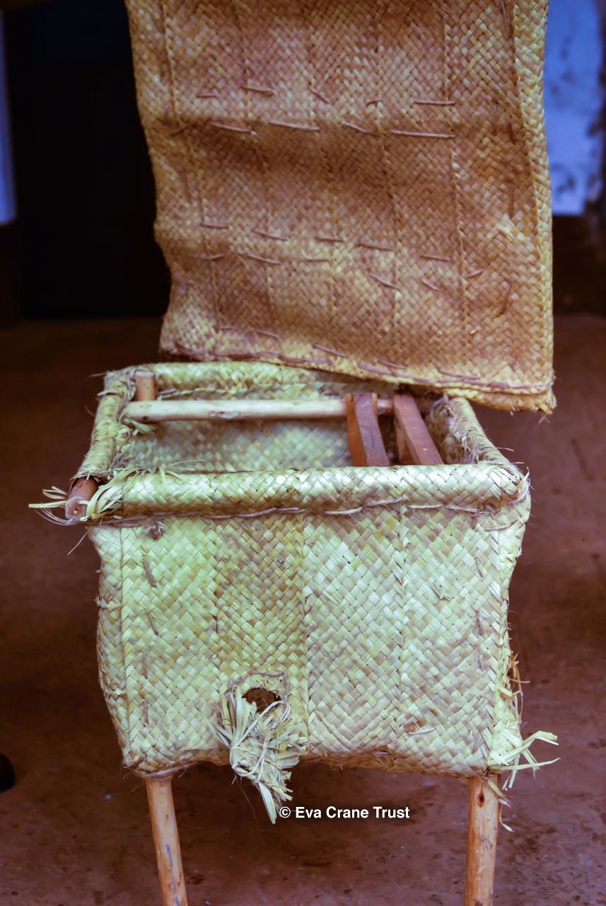 ETHIOPIA, Sept / Oct 1973, Holetta Beekeeping Station, Movable-frame hive of woven banana leaves on framework; frames are triangular (lid in ECT-3869).