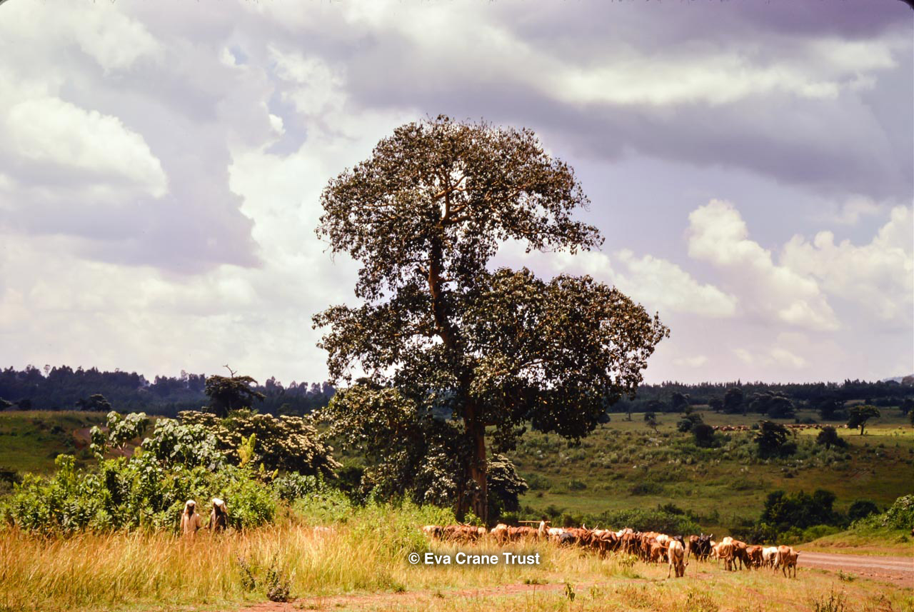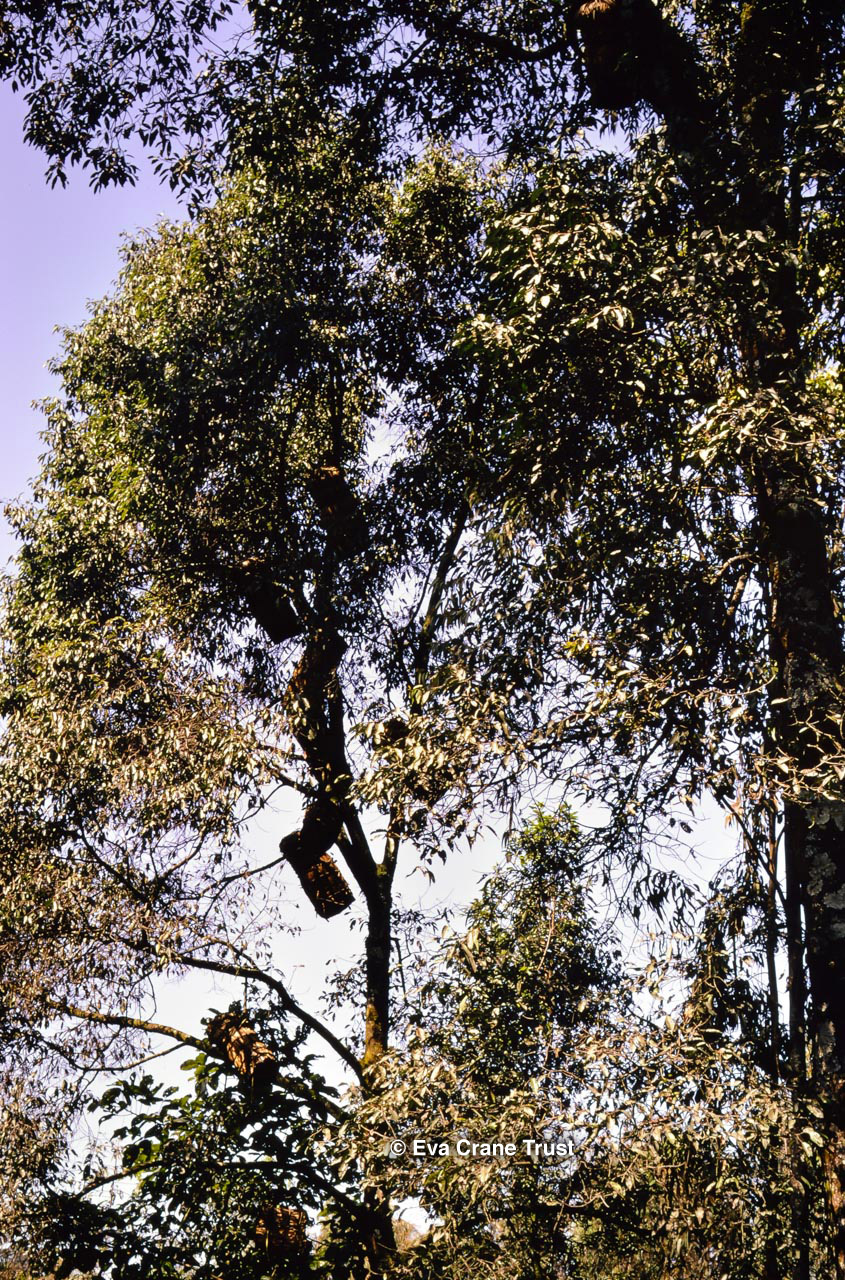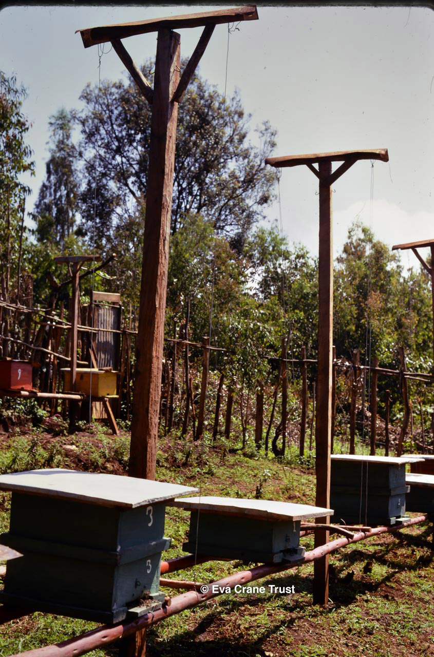 ETHIOPIA, Sept / Oct 1973, Nekemte, Hives of Ato Berhann Wolde-Giorgis. Fixed-comb hanging in trees.