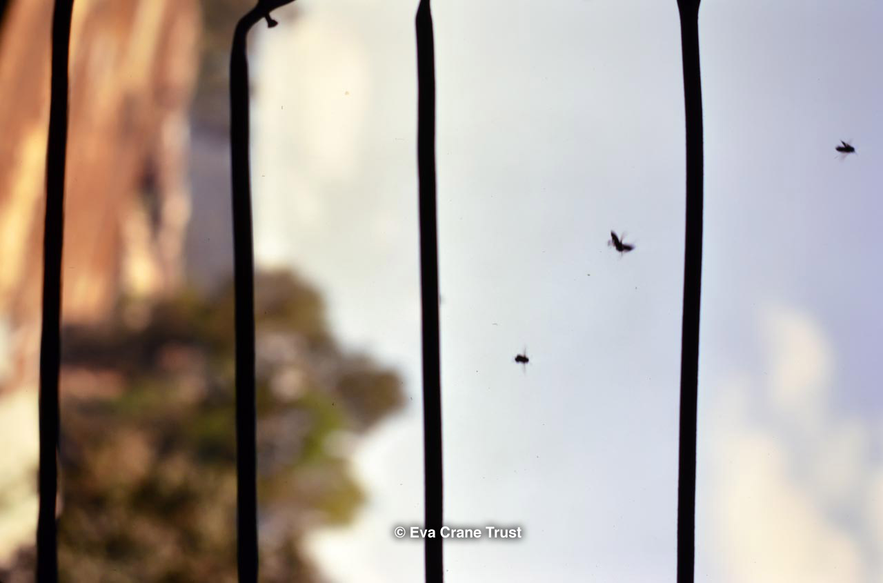 ETHIOPIA, Sept / Oct 1973, Visit to A.m. adansonii colony in bedroom, Children's bedroom window. Bees flying.
