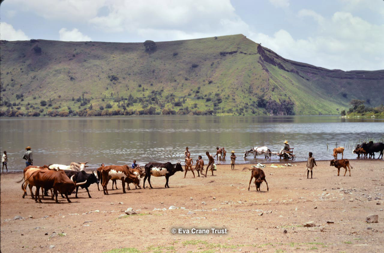 ETHIOPIA, Sept / Oct 1973, Rift Valley (Maskal holiday), Crater Lake at Debre Zeyet with cattle being watered.
