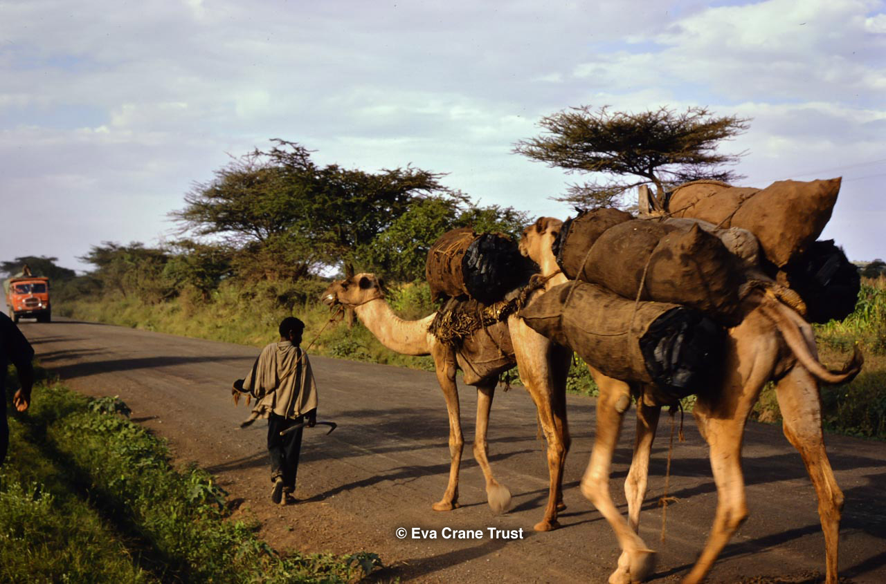 AFRICA, SEPT./OCT. 1973, Ethiopia, Rift Valley (Maskal holiday), Camels carrying charcoal
