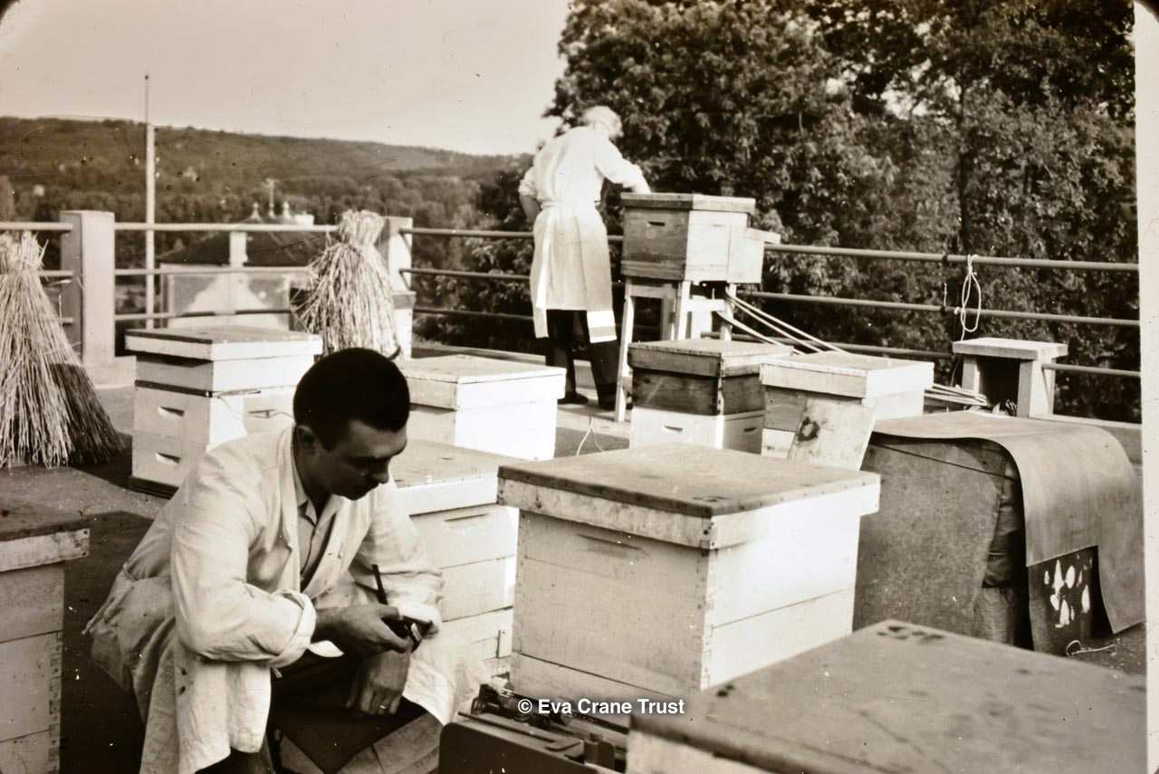 FRANCE BEEKEEPING, 1950, Bee Research Station Bures-sur-Yvette, Roof apiary with Dr Louveaux and Dr Chauvin.