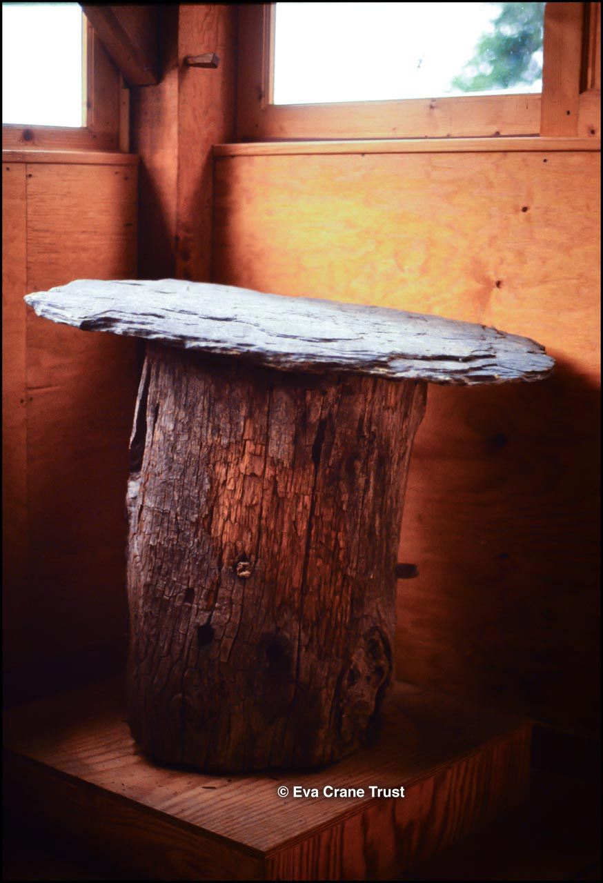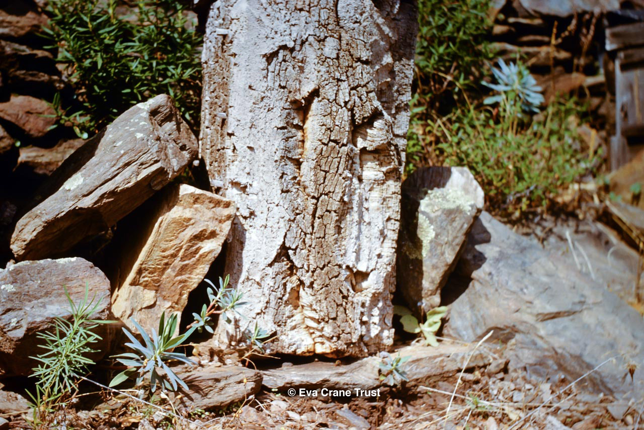 FRANCE, Museum La Cite des Abeilles St Faust Bearn October 1991, Upright log hive (Spanish chestnut) covered with large sheet of schist, beekeeping.