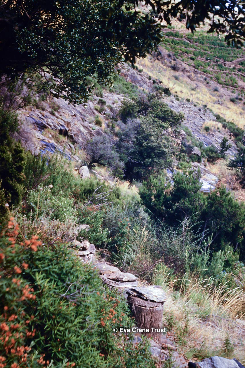 FRANCE, Montfavet, 1962?, Val des Abeilles near Banyul Pyrenees. Apiary of cork hives, beekeeping.