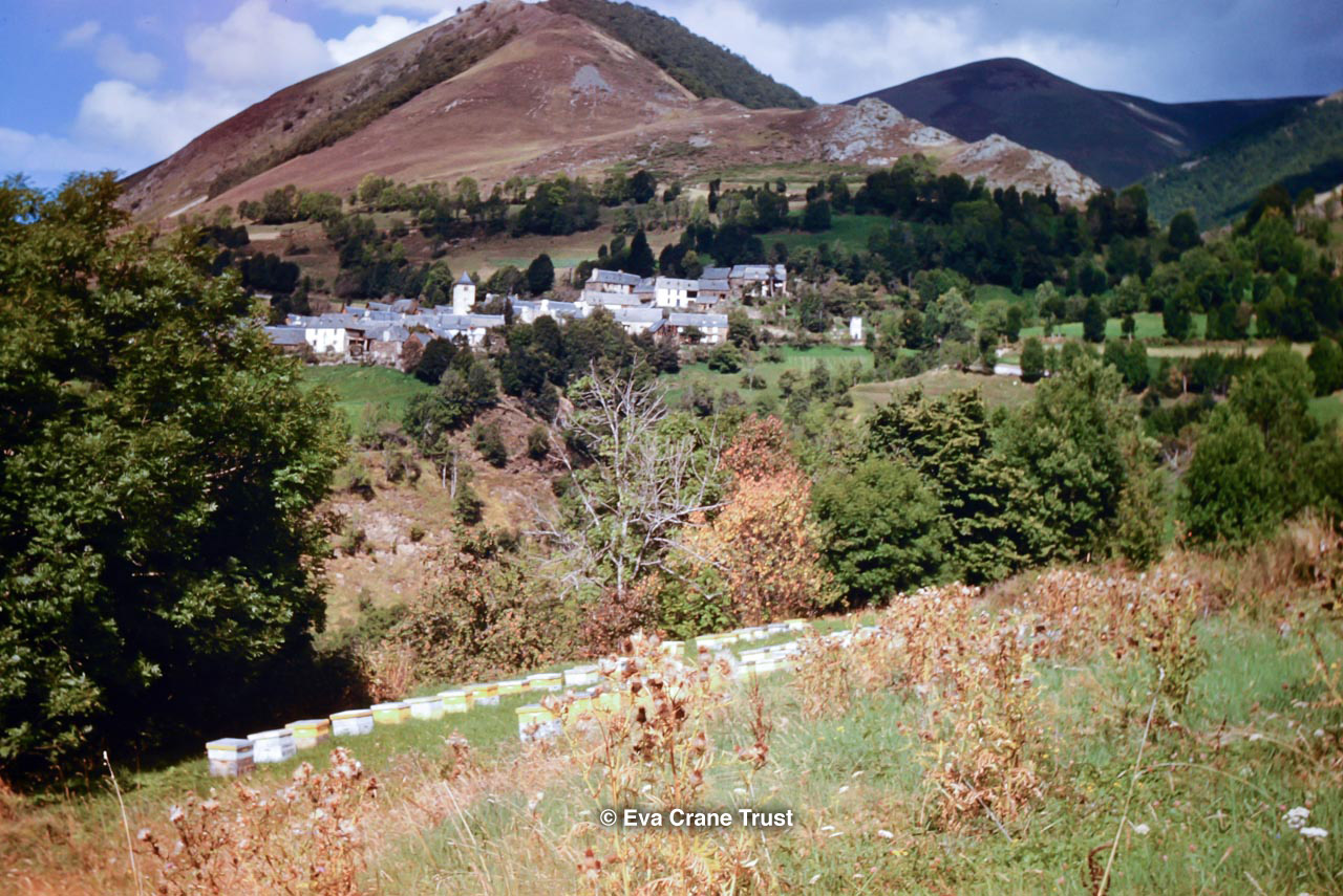 FRANCE, Montfavet, 1962?, Apiary above Neste de Lourons with village of Mont (Haute Garonne) "suspendu sur un plat", beekeeping.