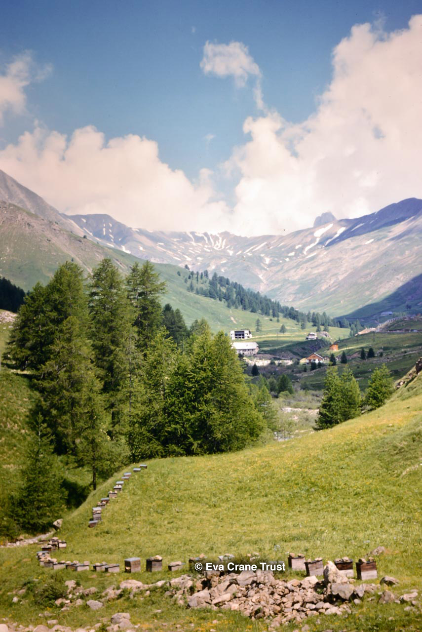 FRANCE, 1962?, Montfavet, Apiary on hillside in French Alps near Barcelonette, beekeeping.