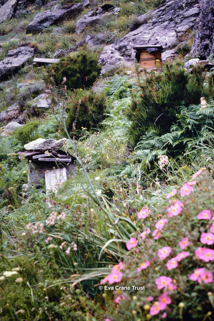 FRANCE, 1963 , Apiary at Sorbollano Corsica. Recumbent hive, beekeeping.