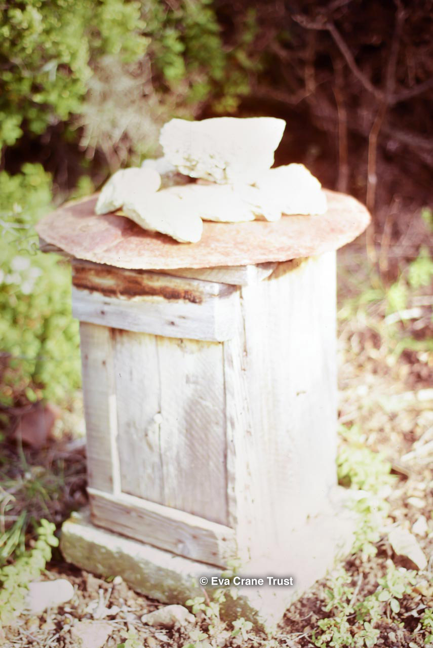 FRANCE, Provence near coast 1974, Upright box hive with large circular stone on top, beekeeping.