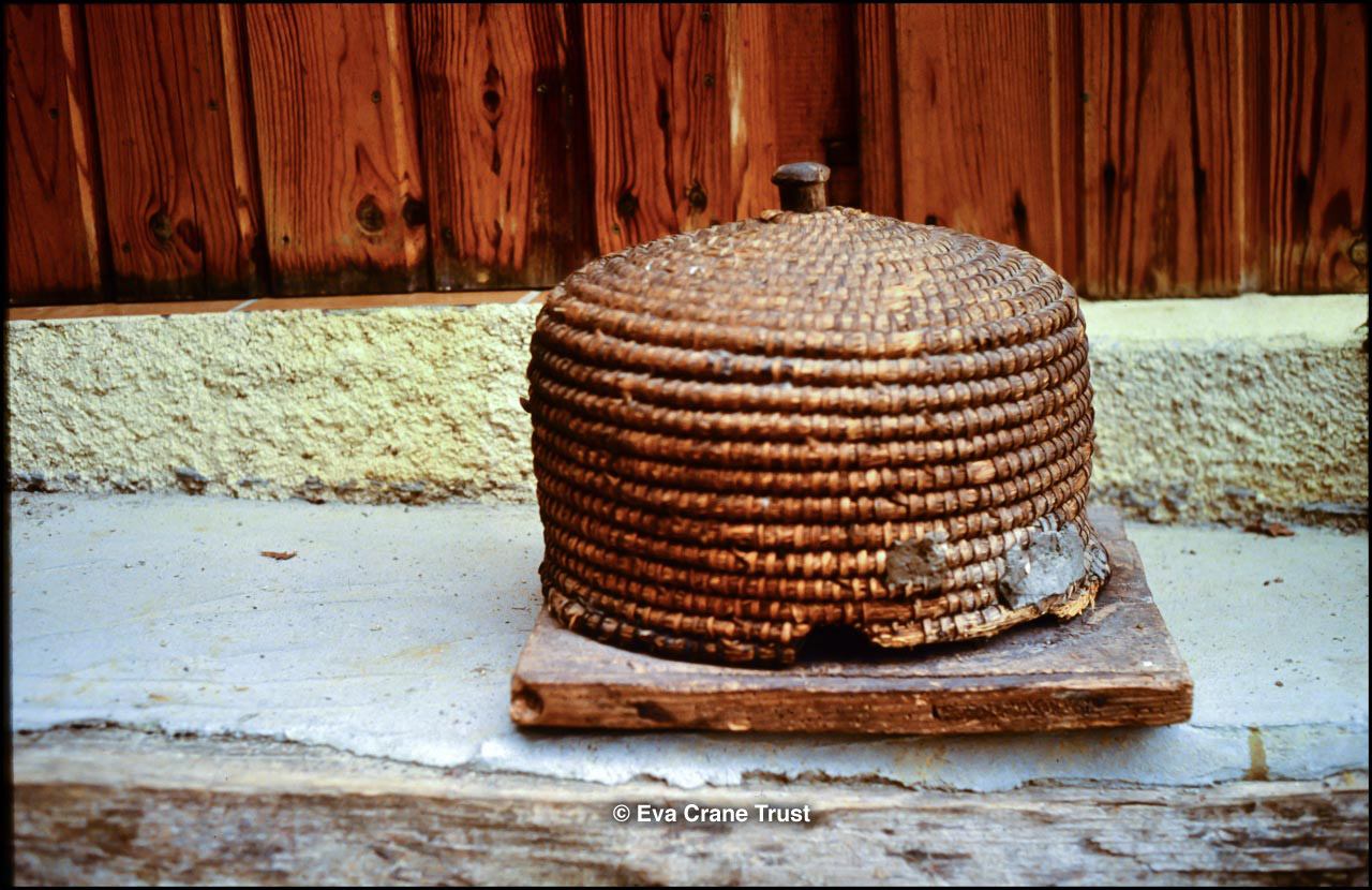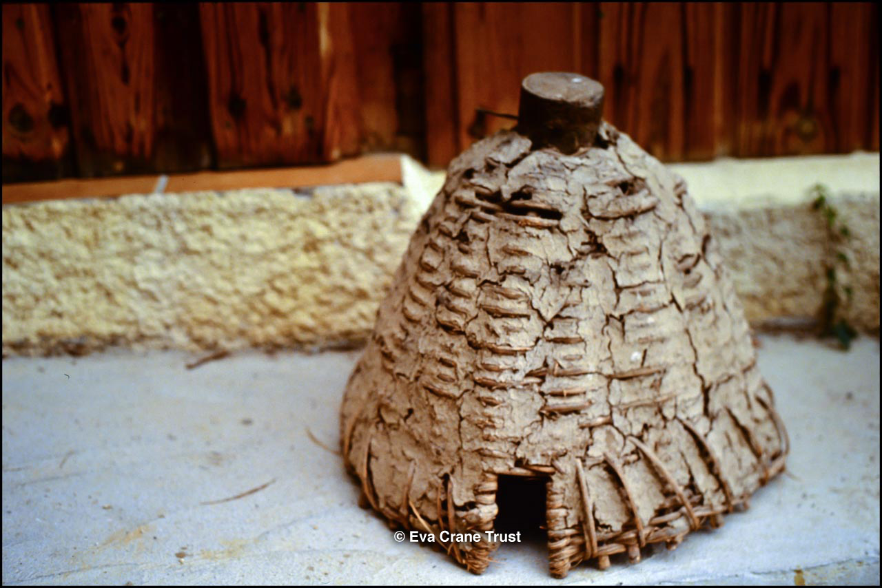 FRANCE, Museum La Cite des Abeilles St Faust Bearn October 1991, Basque wicker skep with crownpiece, beekeeping.