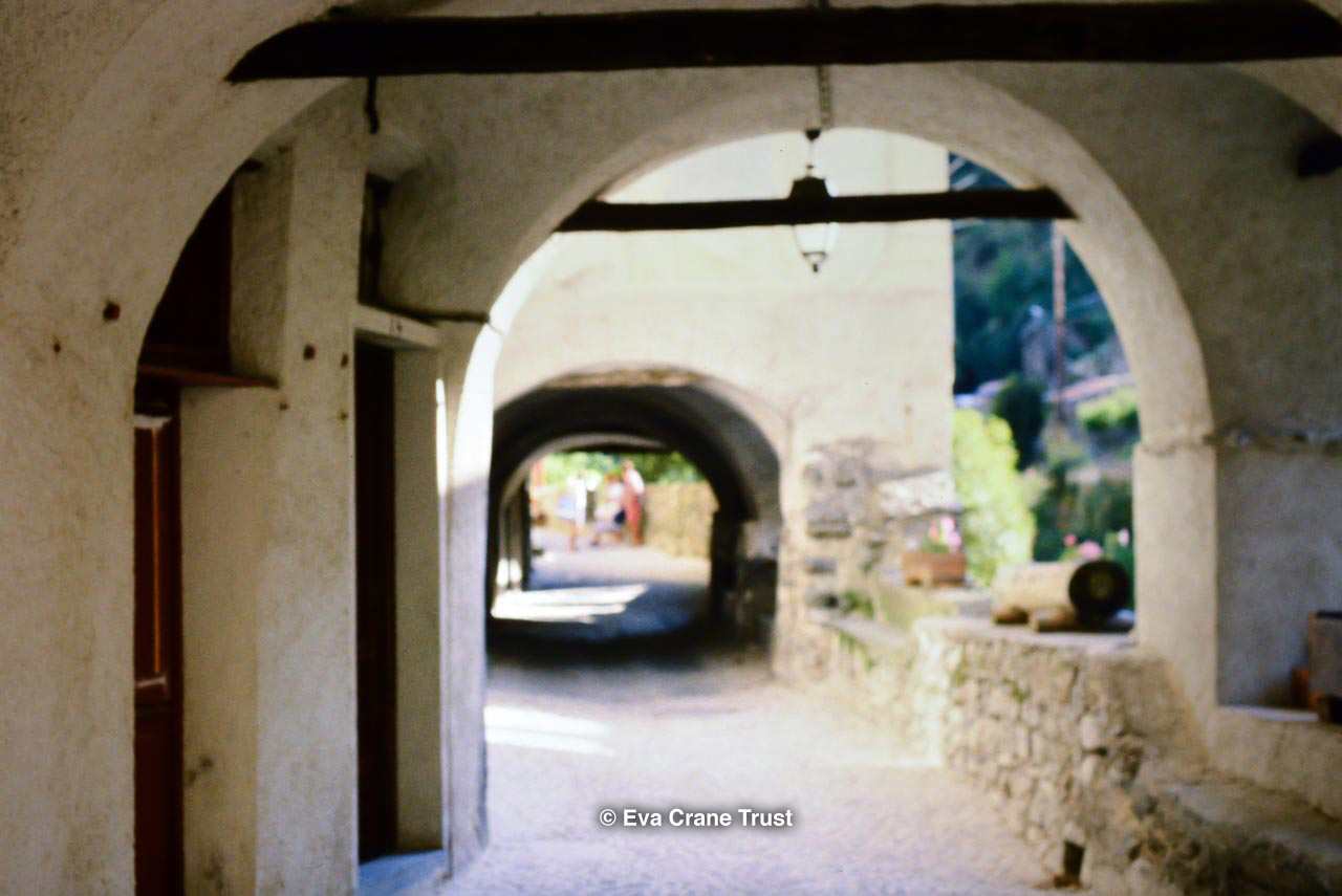 FRANCE, La Brigue arcaded street, beekeeping.