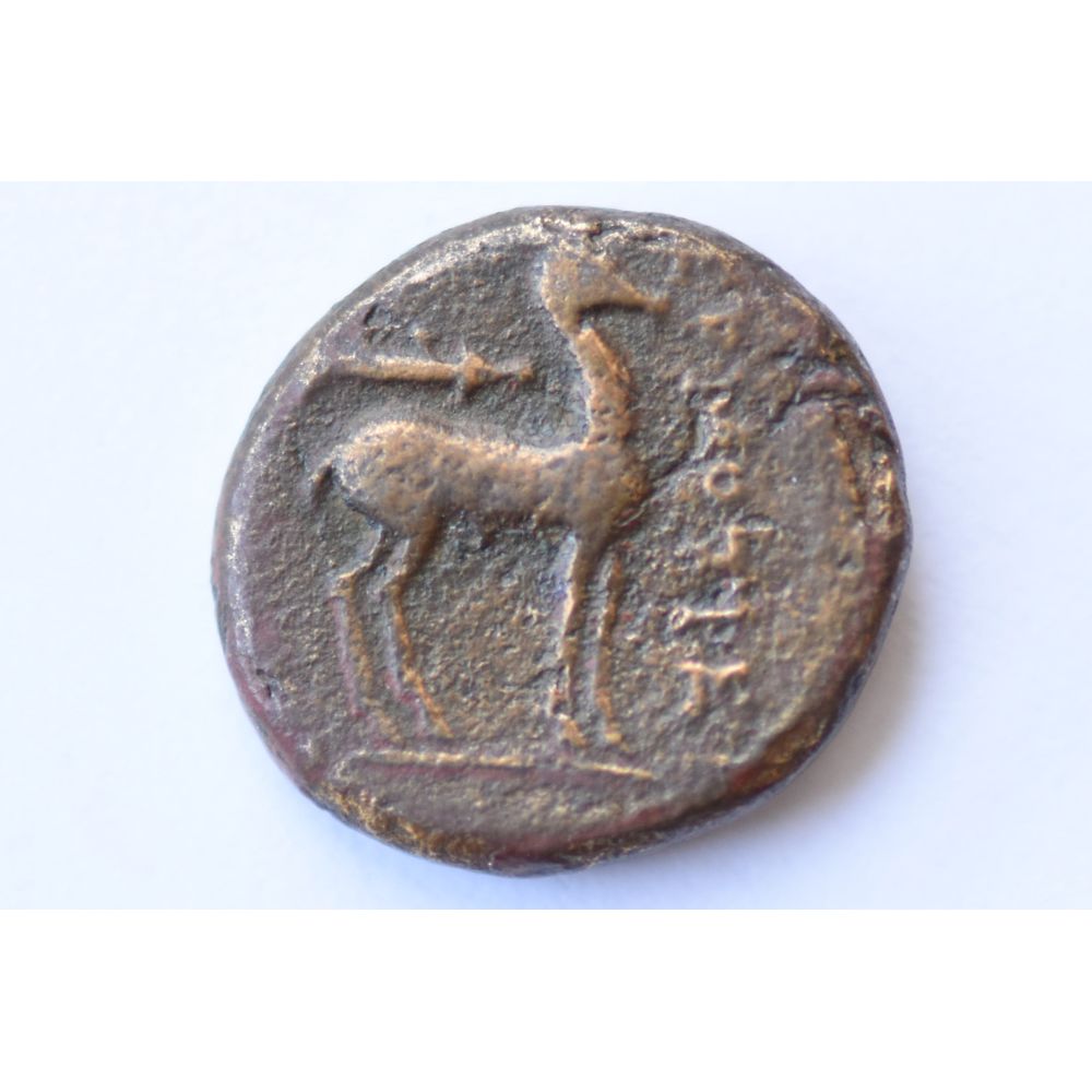 Obverse: bee with straight wings and pollen loads on hind legs; no lettering can be seen. Reverse: stag standing right; lettering = uncertain magistrate's name on the right of stag. Brown patina, light roughness. Near VF (very fine). The bee became a symbol of Ephesus as legend states the Athenians colonized the city led by the Muses, who took the form of bees. The bee and stag pictured on the coins from the city-state are symbols of the goddess Artemis. Artemis oversaw wild bees as the goddess of wild animals and the hunt.