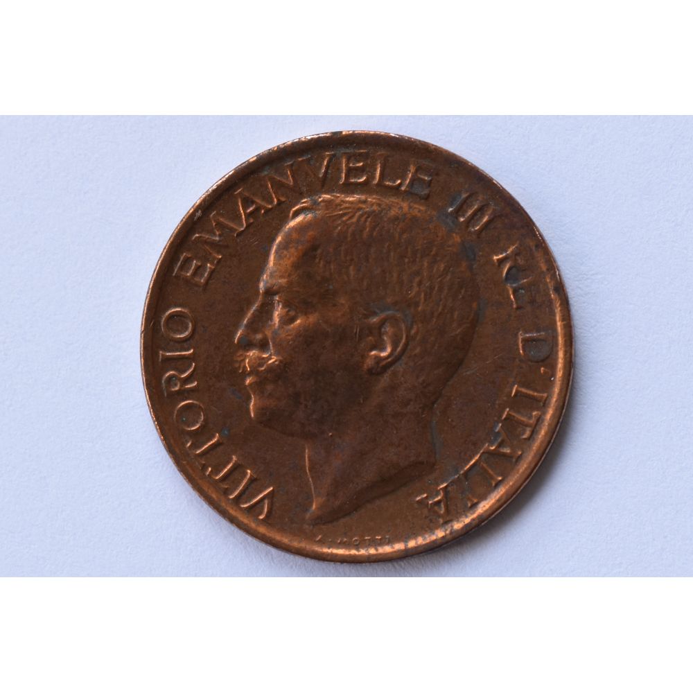 Obverse: bust of King Vittorio Emanuele III facing left, author name below the neck; lettering = VITTORIO EMANVELE III RE D'ITALIA, A. MOTTI. Reverse: a honeybee on a flower, value on the bottom right, date on the bottom, and mintmark to the left; lettering = C.10, R, 1920. Value: 10 Centesimi (0.10 ITL). VF (very fine).
