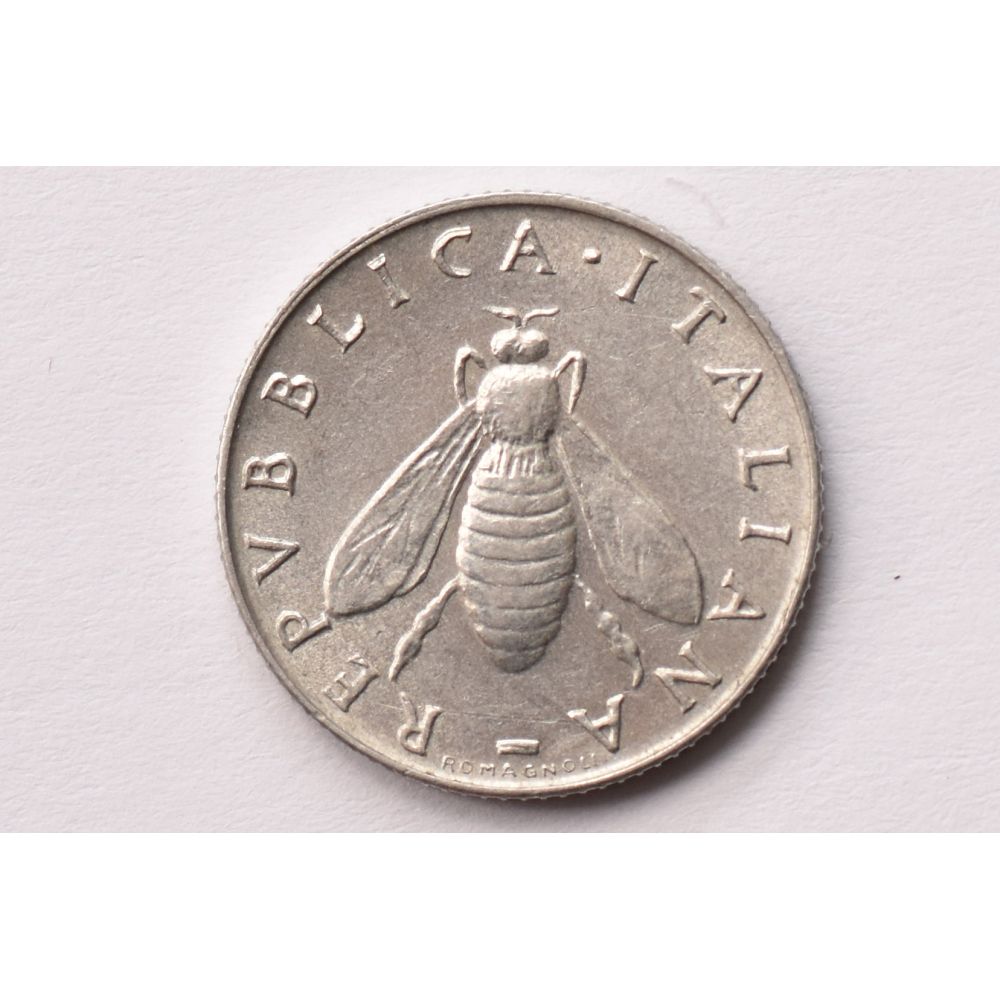 Obverse: bee with straight wings, author name below; lettering = REPUBBLICA.ITALIANA, ROMAGNOLI. Reverse: olive branch, value in number at left, date and mintmark below; lettering = 2, 1957, R. Value: 2 Lire (2 ITL). VF (very fine).