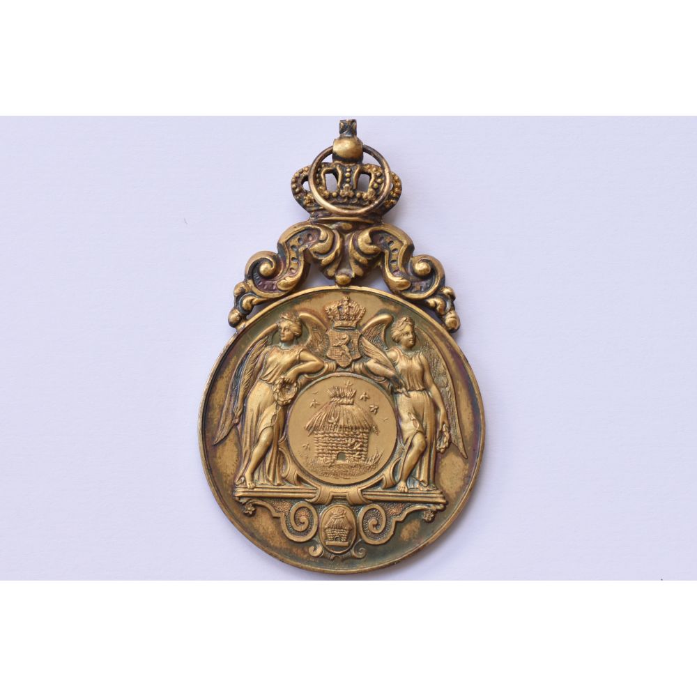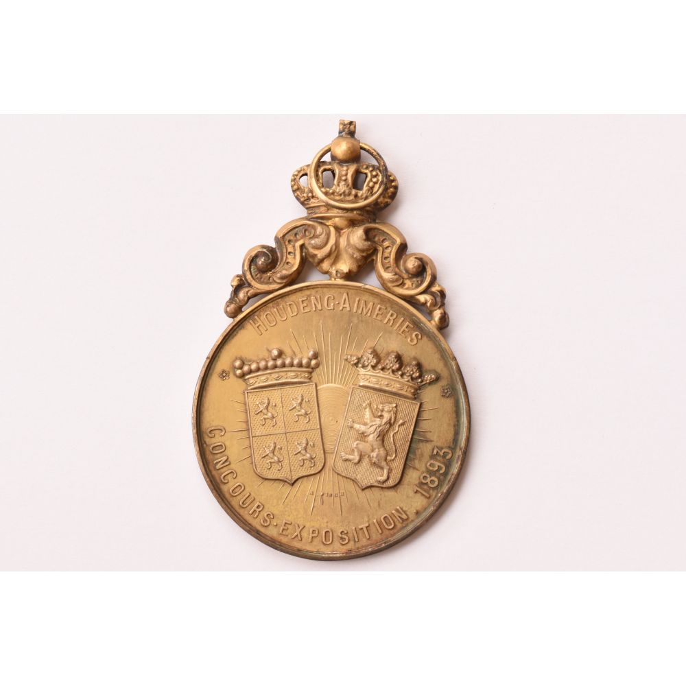 Obverse: beehive and two angels. Reverse: two crowned coats of arms with respectively one and four lions; lettering = CONCOURS.EXPOSITION.1893 HOUDENG.AIMERIES. Houdeng-Aimeries is a village of Wallonia and a district of the municipality of La Louvière, located in the province of Hainaut, Belgium.