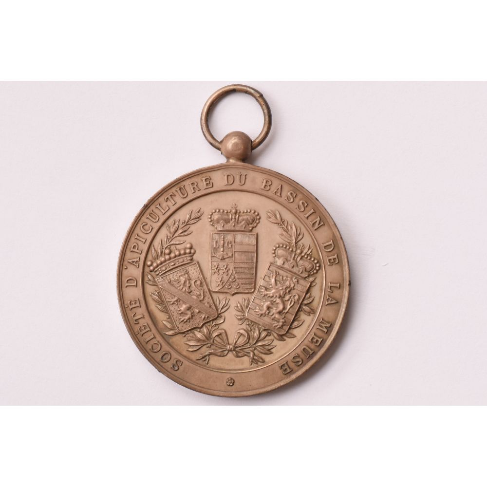 Obverse: beehive with trees and flowers; lettering = NAMUR 1893. Reverse: three coats of arms; lettering = SOCIÉTÉ D'APICULTURE DU BASSIN DE LA MEUSE (Engl.: Meuse basin beekeeping society). Namur is a city and municipality in Wallonia, Belgium.