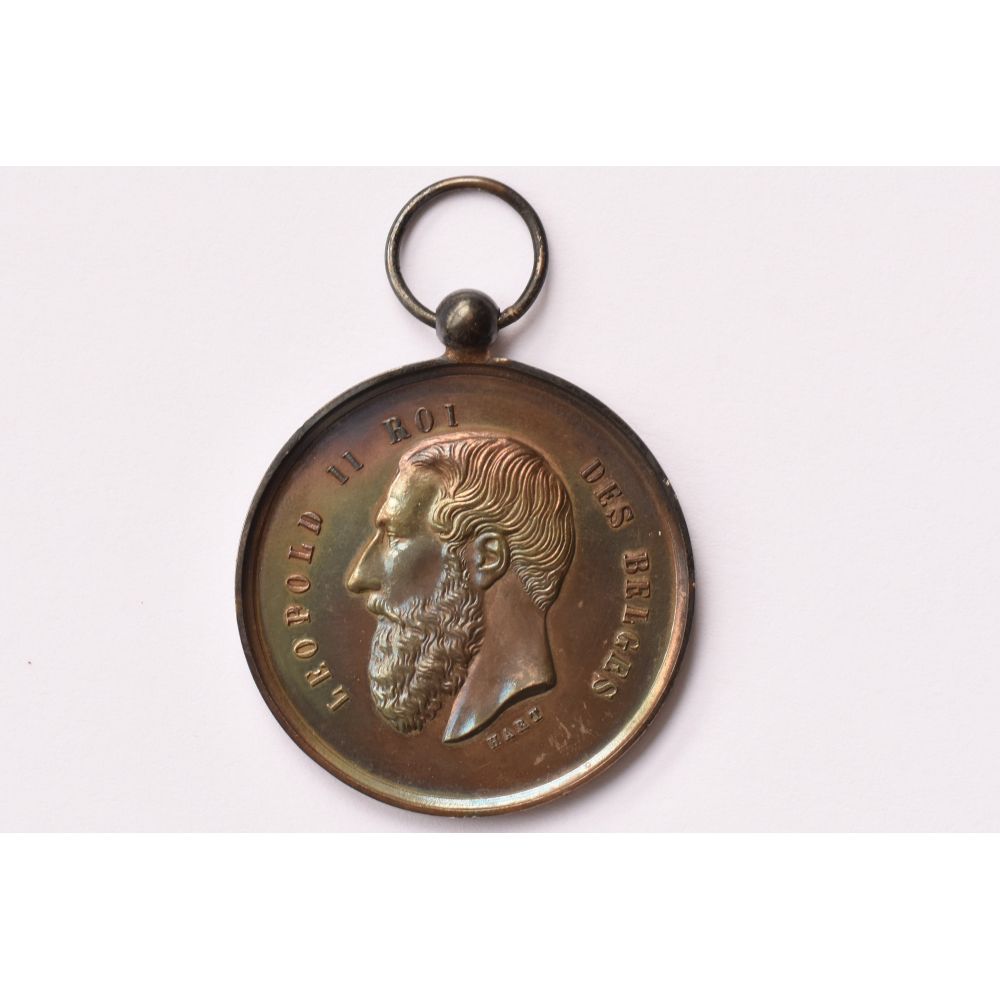Obverse: bust of Leopold II facing left, signed; lettering = LEOPOLD II KONING DER BELGEN (Engl.: Leopold II King of the Belgians), HART. Reverse: beehive and wreath of flowers, fruit and tools; lettering = CONCOURS INTERNATIONAL D'APICULTURE (ENGL.: International beekeeping competition), NAMUR, 1893. Namur is a city and municipality in Wallonia, Belgium.