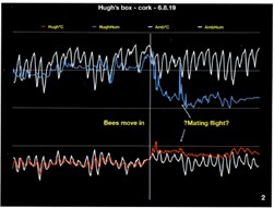 One of the boxes was made of cork (40 mm thick) which has thermal conductivity in board form of about a third that of softwood. All had been placed by mid-May, eight in trees in older woodlands and one in a garden on a stand. We received enthusiastic engagement from the local National Trust properties, the RSPB (Royal Society for the Protection of Birds) which helped us place one of the boxes on a wooded island on Lower lough Erne and private landowners interested in the project. By the end of the swarming season, four out of the ten boxes in place had been occupied by swarms - two within 10 and 11 days of being installed. The sensors generated very useful and interesting data, repeating and extending the data from the 2018 pilot box. By the end of the year (2019) one of the colonies had perished.