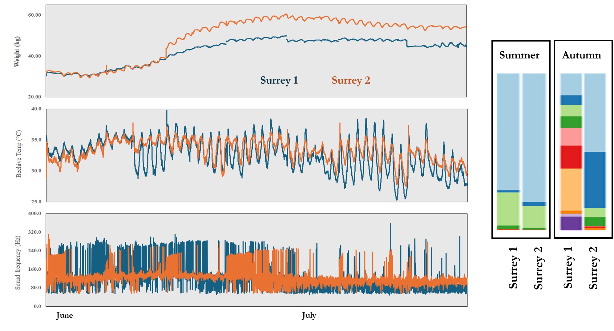 Amount of honey and pollen accumulated in two of the beehives located on the University of Surrey Campus over a 3-month period (measured in Kgs) and their corresponding internal temperature (°C) and sound frequency (Hz). On the right the relative abundance of the top bacteria present within each hive is illustrated with different colours and grouped by season of sample collection. Light blue represents the relative abundance of LAB.