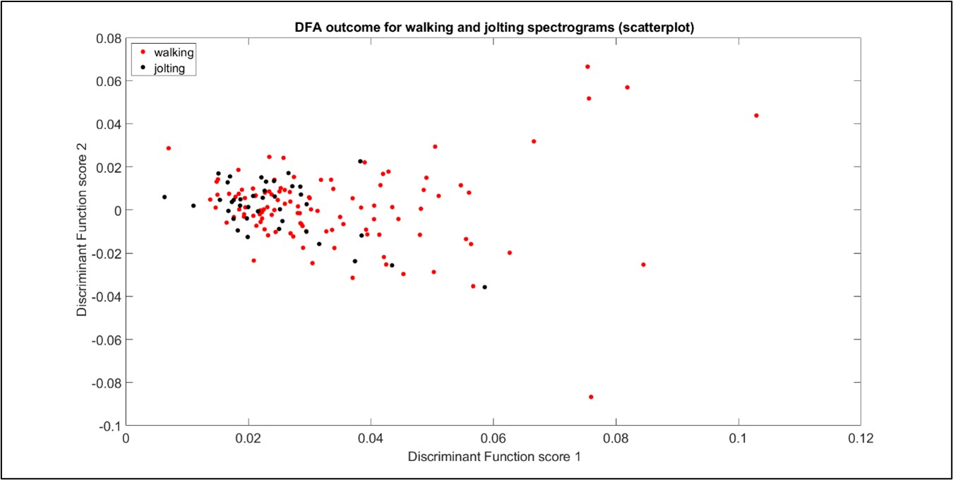 Utilising the results from our previous study, we were able to build a training database of known Varroa vibrations (jolting and walking) from recordings where mites were seen to produce the behaviours of interest. The vibrational waveforms of each jolting pulse and walking pulse captured when a mite was placed on a piece of brood-comb (3 x 3cm) were first transformed into spectrograms, and then into Two-dimensional-Fourier-transforms (2DFTs), for seeking out discriminatory features between the two types of vibration. Principal component analysis and discriminant function analysis were undertaken to achieve this.