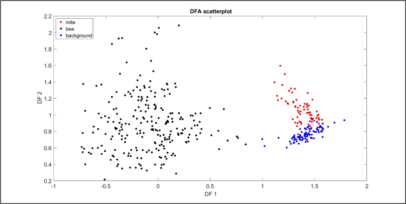 Due to the very low Signal to Noise Ratio inherent to all our recordings, we proceeded in trying to cluster three categories of vibrational waveforms: those of mite walking, bee emergence and background noise (as background noise was also present in all recordings). In trying to establish a feature reliably specific to these, we eventually found that the 2DFTs for each group exhibited highly characteristic features, showing excellent promise for discrimination (see Figure 2). Following principal component and discriminant function analyses, the three groups of selected signals (i.e. during ‘training’ of the software) clustered well, demonstrating that mite walking vibrations can be discriminated from honeybee vibrations when in the capped brood cells (see Figure 3). Upon projecting the full length of our recordings (‘testing’ of the machine learning) onto the same DF space, we also found that the data systematically collapsed onto the correct category.