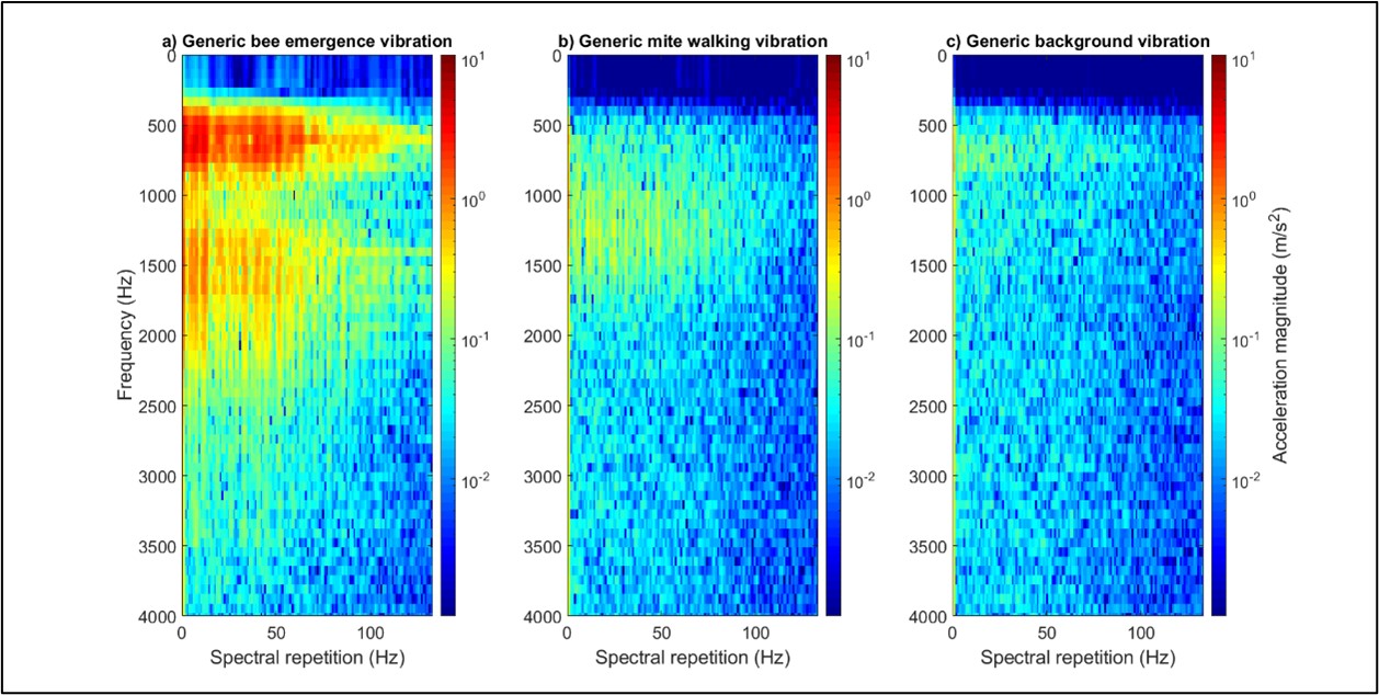 We are now in a position to draft a manuscript for peer-reviewed publication, demonstrating that we are the first to detect and identify the specific vibrational trace of a mite walking, and that we can clearly discriminate between this and the vibrations of an emerging honeybee. This research is an important step towards the remote detection of Varroa in honeybee colonies.