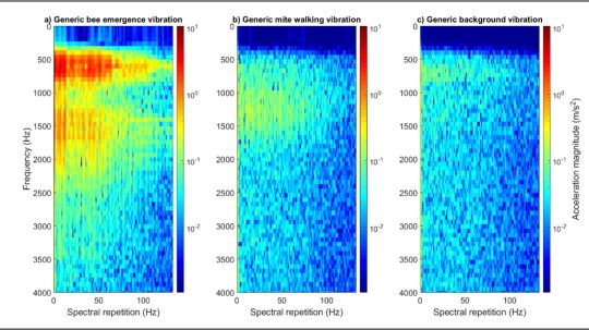 Figure 2: One-second-long extracts of bee (panel ‘a’), mite (panel ‘b’) and background (panel ‘c’) vibrations, viewed as 2DFTs. The differences between the three types of signals can be seen here. All accelerometer data has been high pass filtered (500 Hz) to reduce the impact of background vibrations on the clarity of the mite traces in particular. No traces of interest were identified beyond 3500 Hz. Magnitude of acceleration is in logarithmic (to the base 10), where dark red is the maximum (10.6 m/s2), and dark blue is the minimum (1/10000th of the maximum). All three panels have been scaled identically.